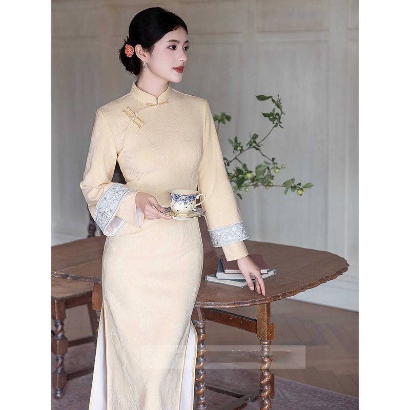 新中式 复古百搭改良旗袍连衣裙子女秋冬收腰显瘦蕾丝拼接丝绒长裙