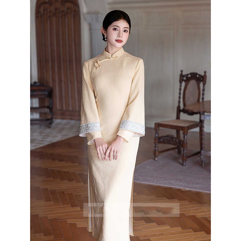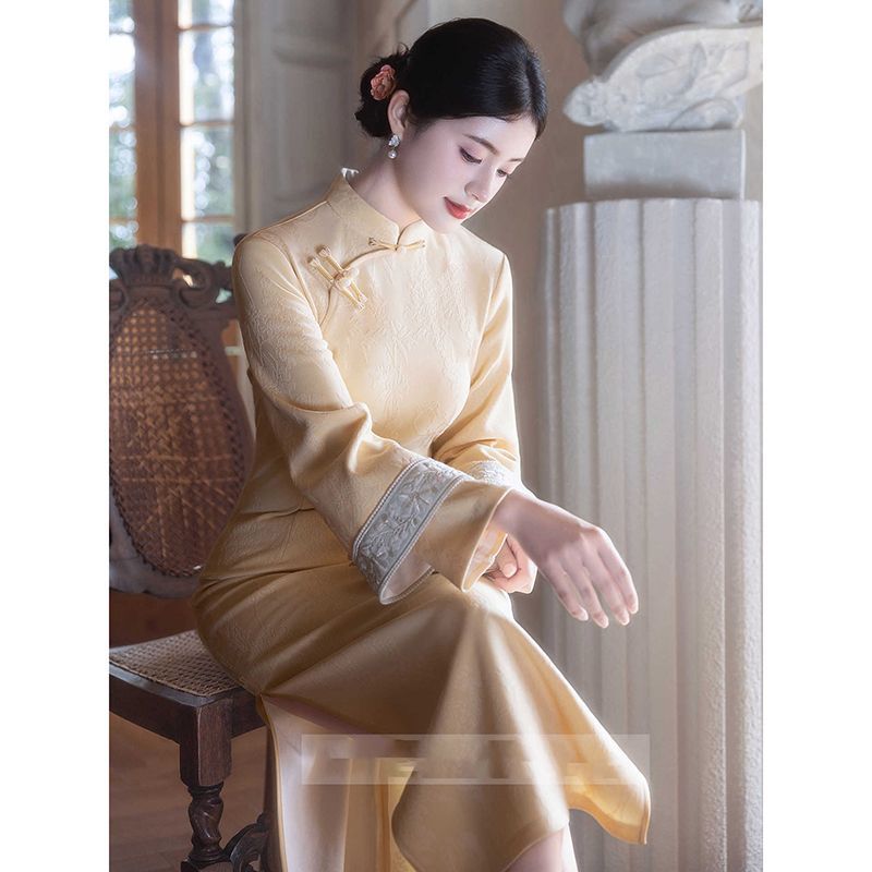 改良旗袍长款 新中式 国风V领长袖 新款 裙子 粉色连衣裙女2025年秋季