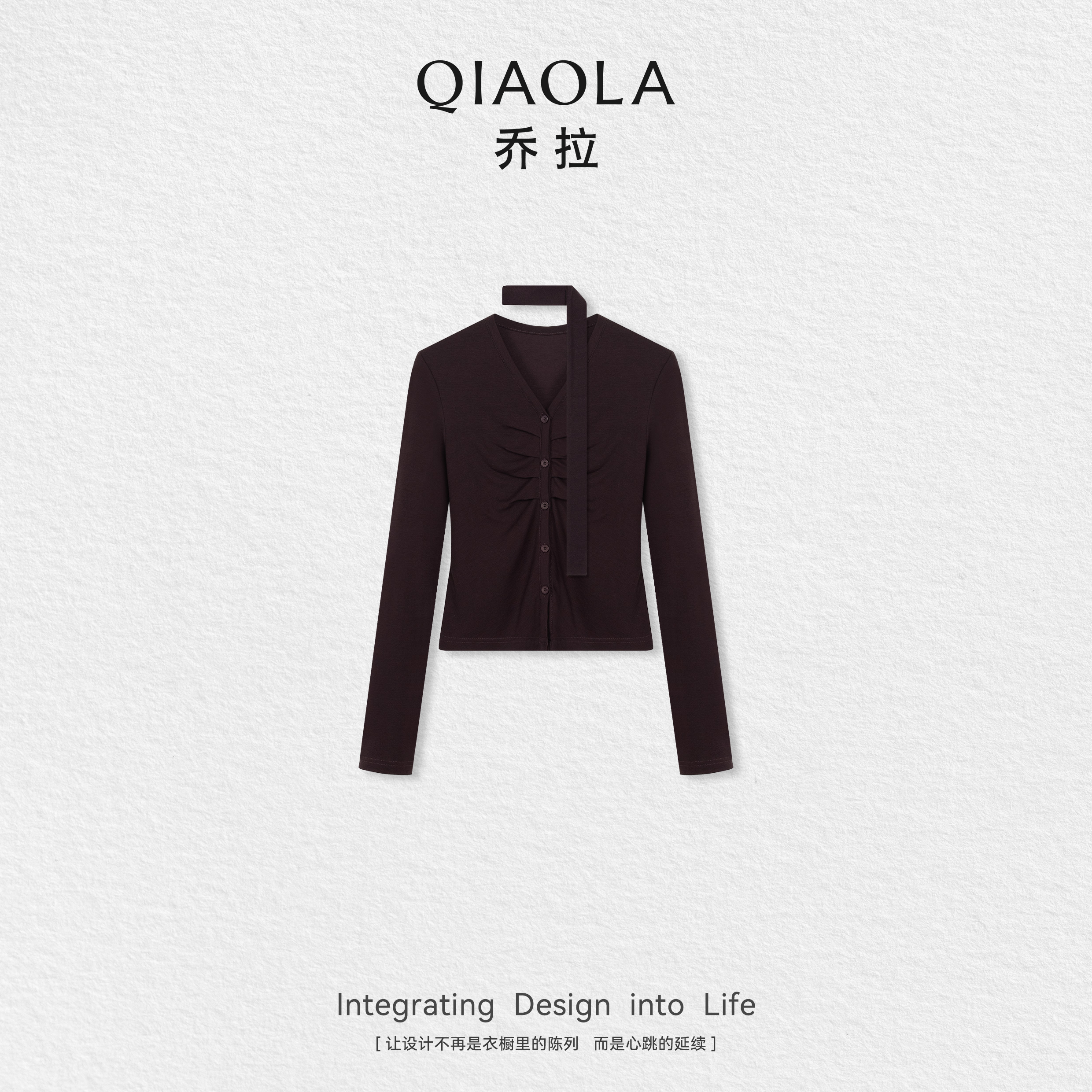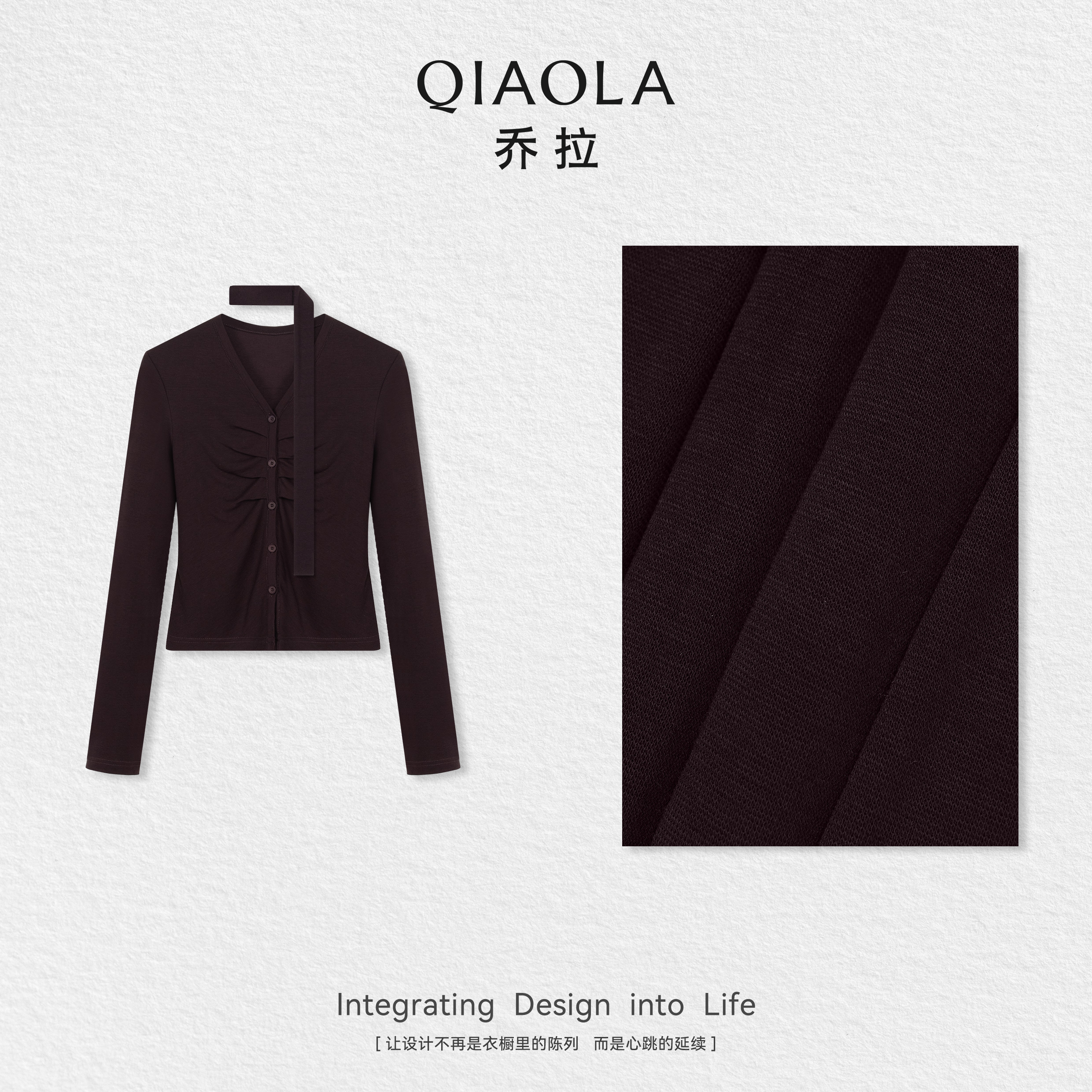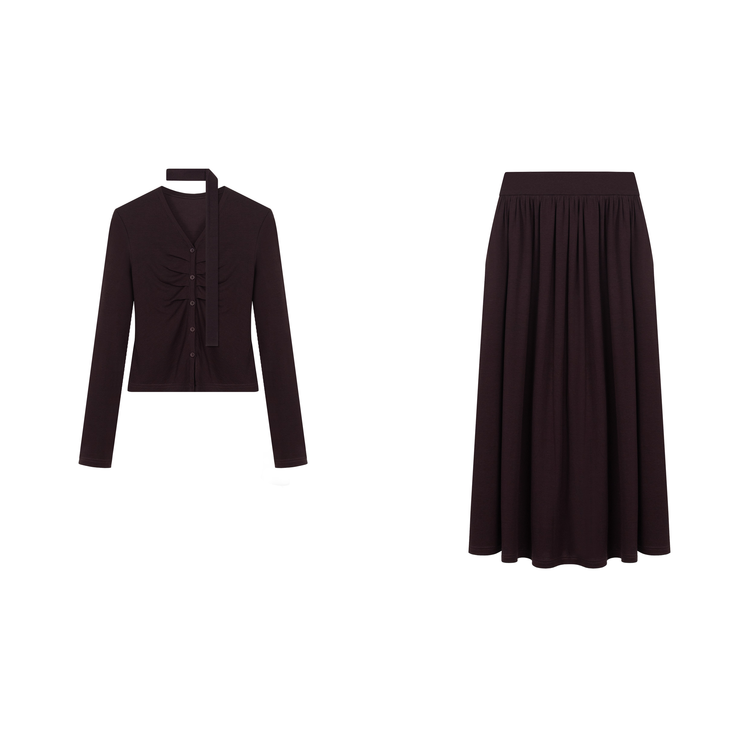 新款 秋季 复古紫色V领长袖 针织衫 女 乔拉 上衣半裙套装 暗紫生红
