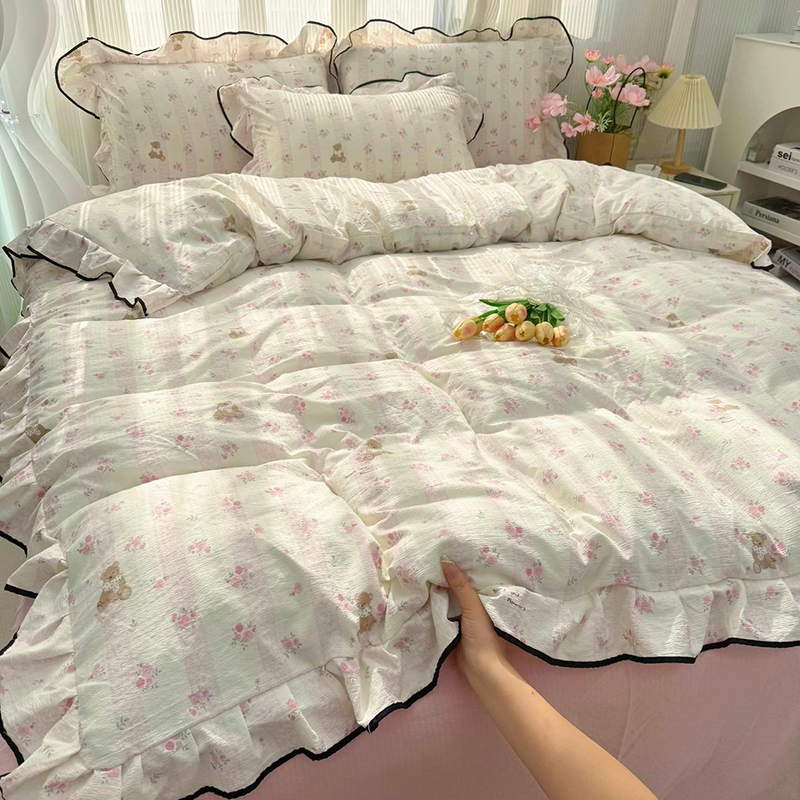 公主风 100云感木棉四件套荷叶边加厚床单被套床笠床上用品4花边