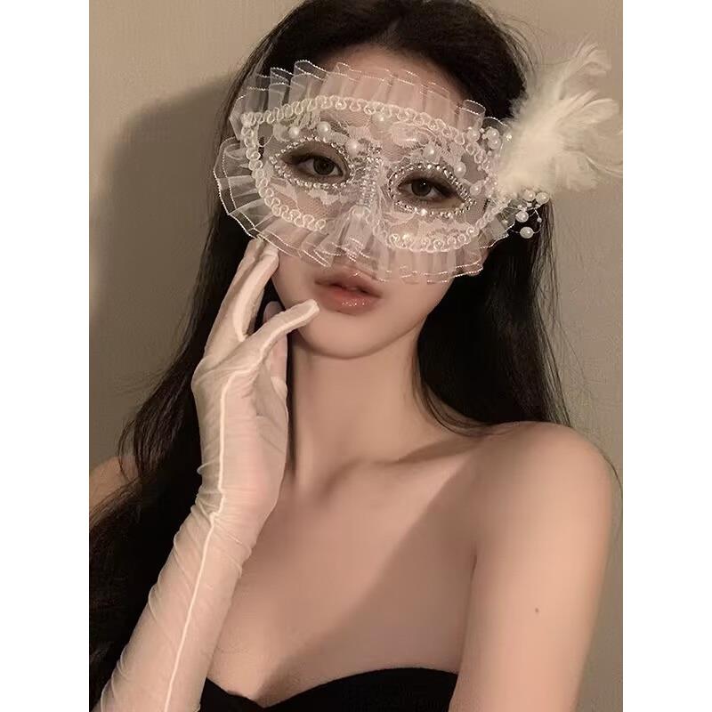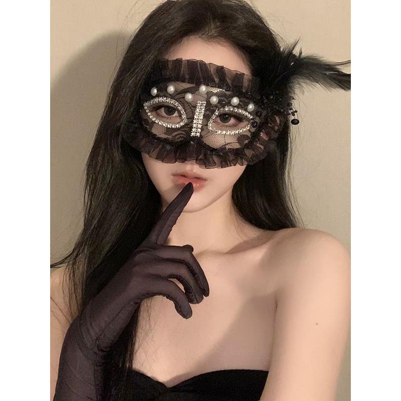 舞会派对半脸面具珍珠羽毛黑色假面晚宴装 饰品万圣节化妆配饰道具