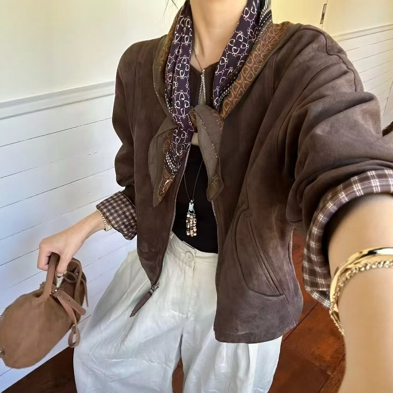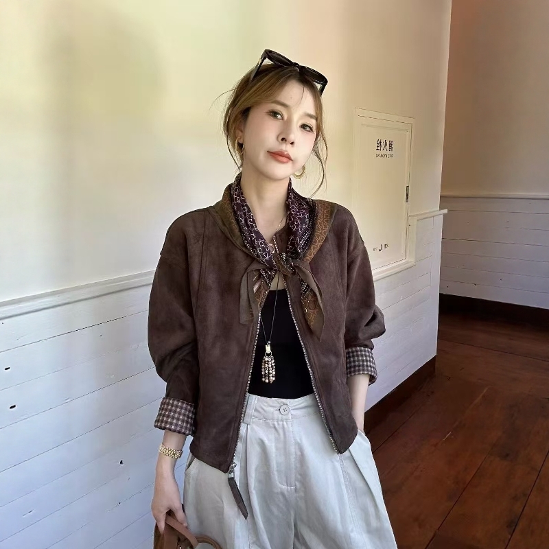 上衣配丝巾潮 新款 欧洲站高级感袖 口格子拼接麂皮绒外套女2025秋季