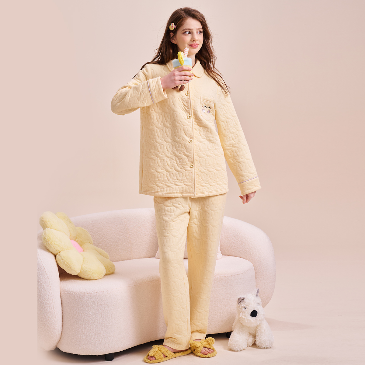 加大码 套装 家居服春秋 秋冬季 芬腾女士睡衣空气棉夹层纯棉加厚长袖