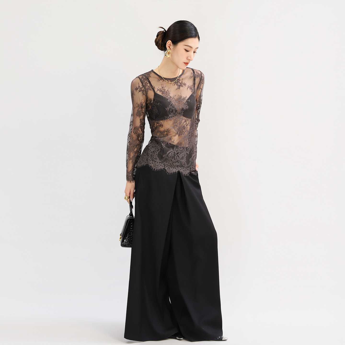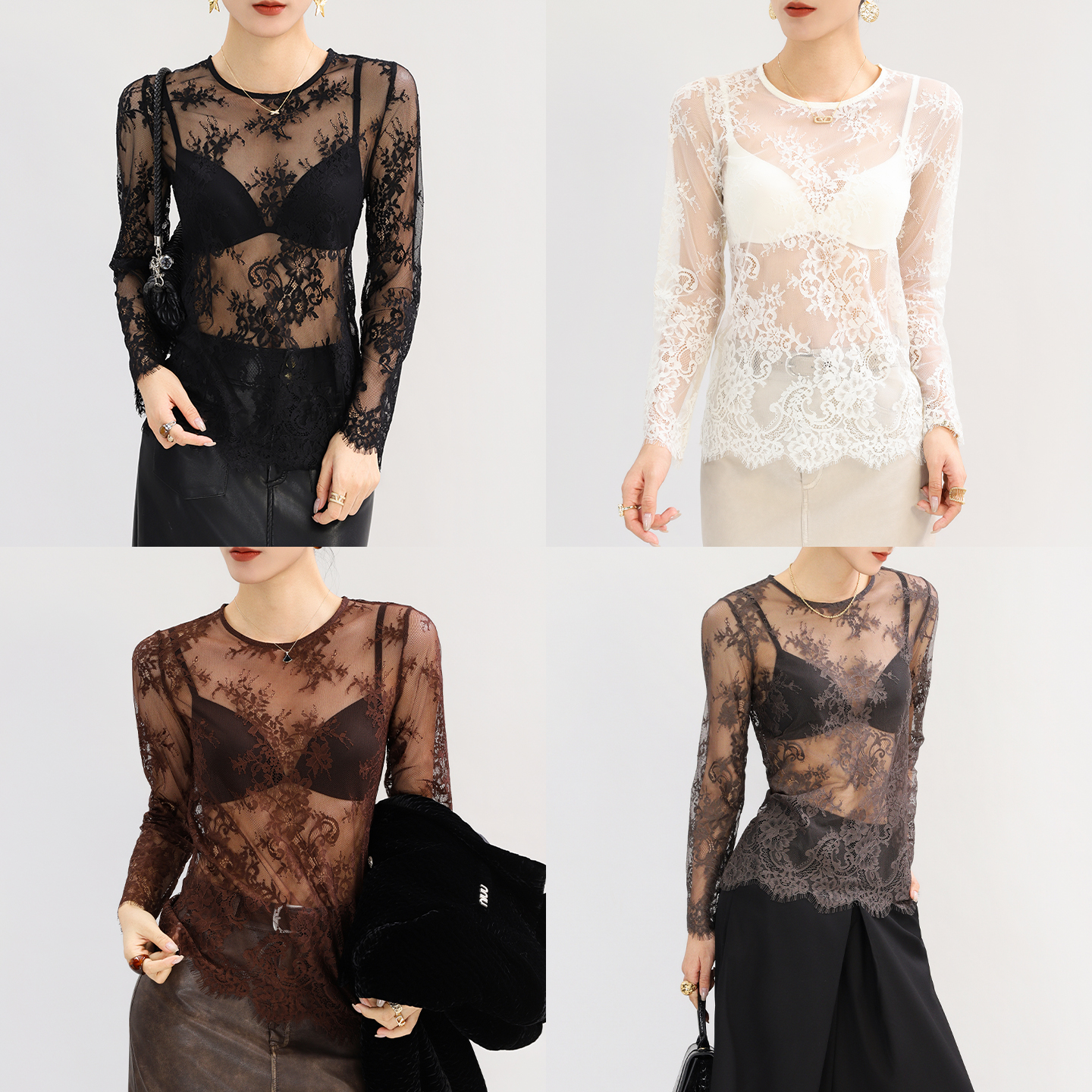 蕾丝打底衫 叠穿绝美网纱上衣轻奢高级感薄 女内搭圆领黑色镂空长袖