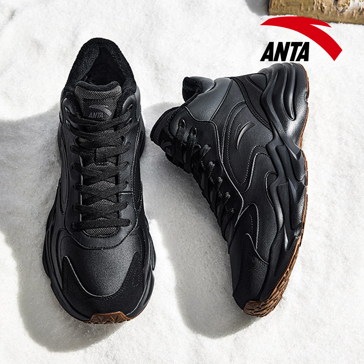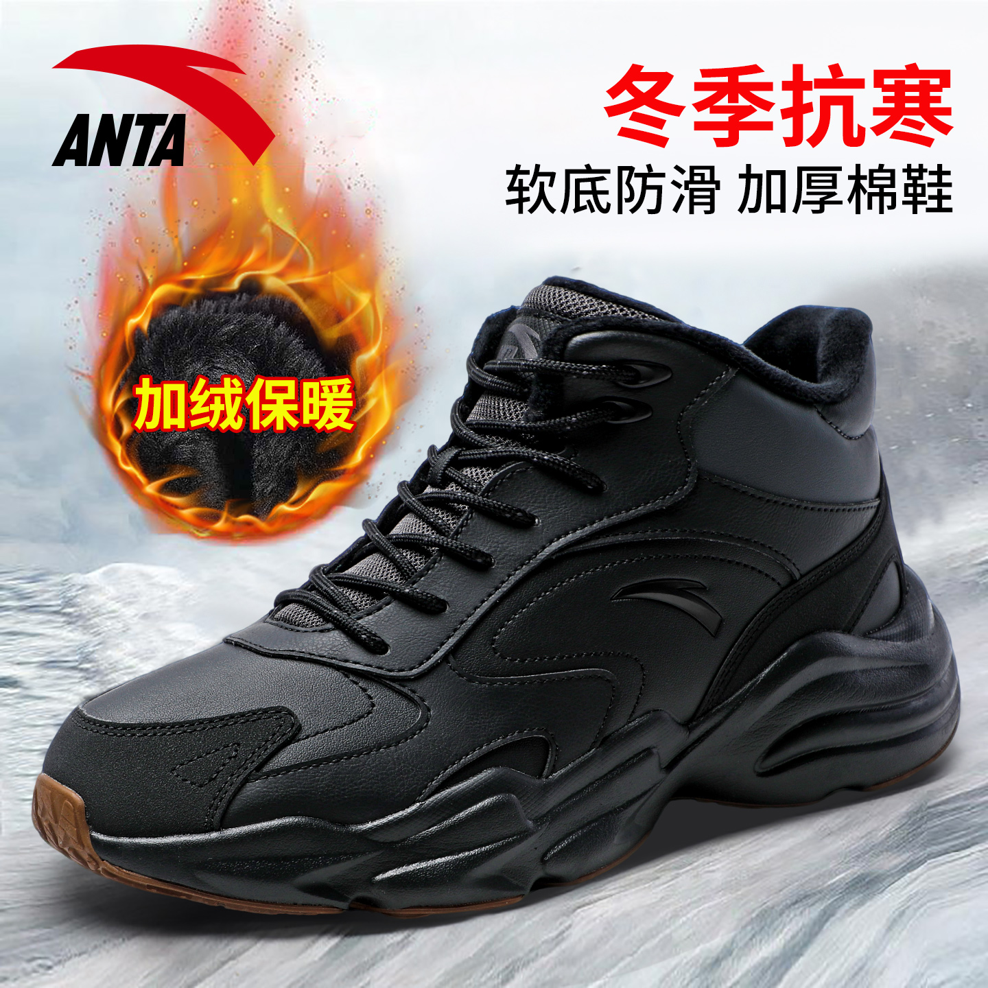 加绒保暖皮面防水黑色雪地靴休闲运动鞋 2025冬季 男鞋 安踏高帮棉鞋