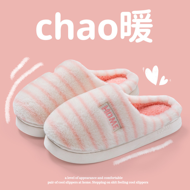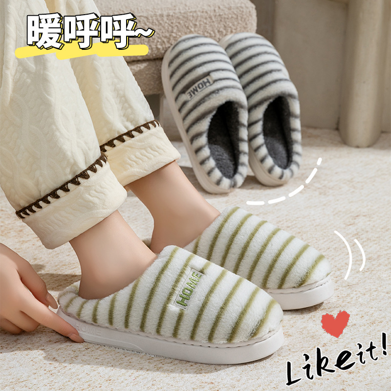 条纹棉拖鞋 加绒厚情侣拖鞋 女款 保暖毛毛鞋 女 室内家居冬季 2025新款