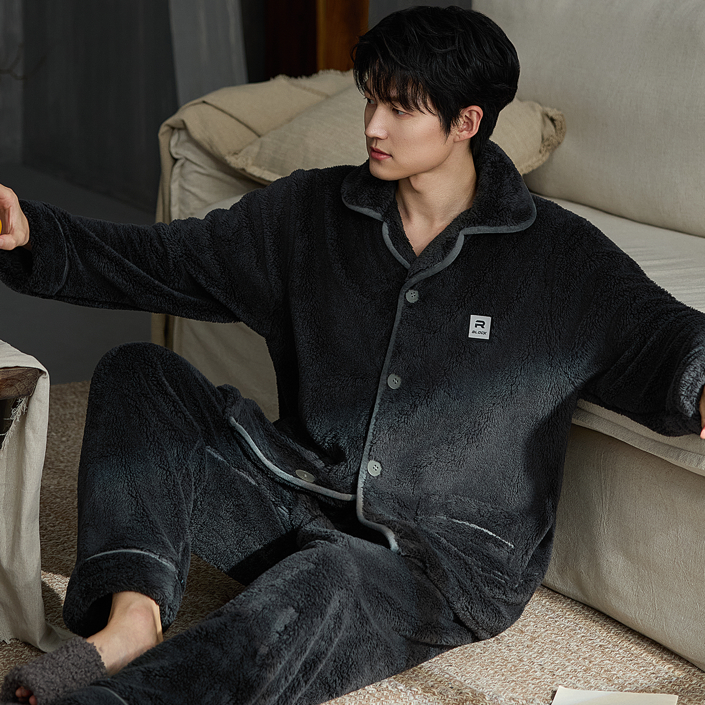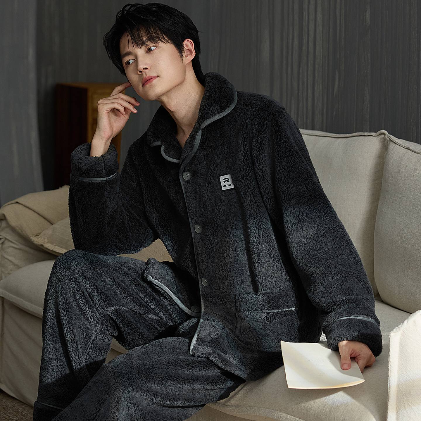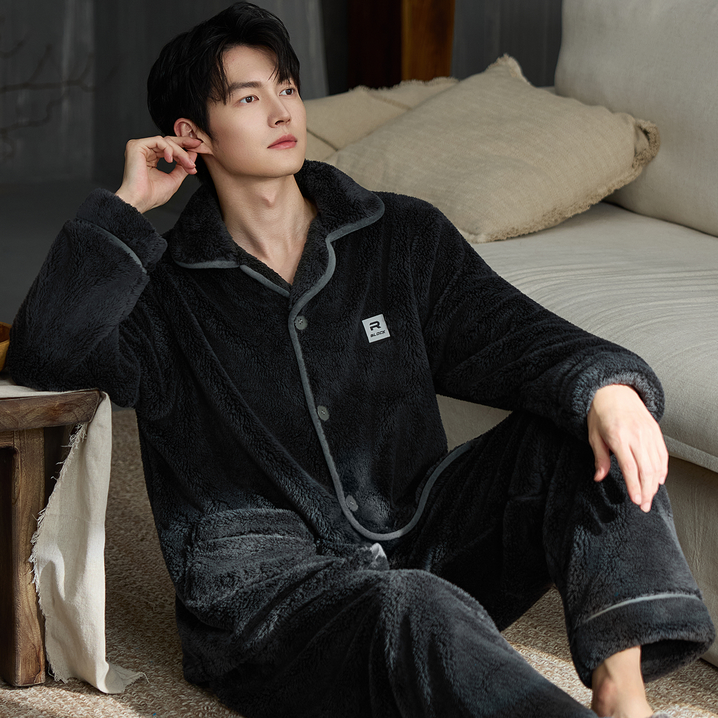 宜而爽珊瑚绒加厚加绒长袖 翻领宽松柔软休闲睡衣秋冬家居服 男套装