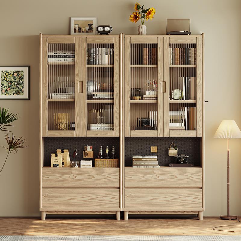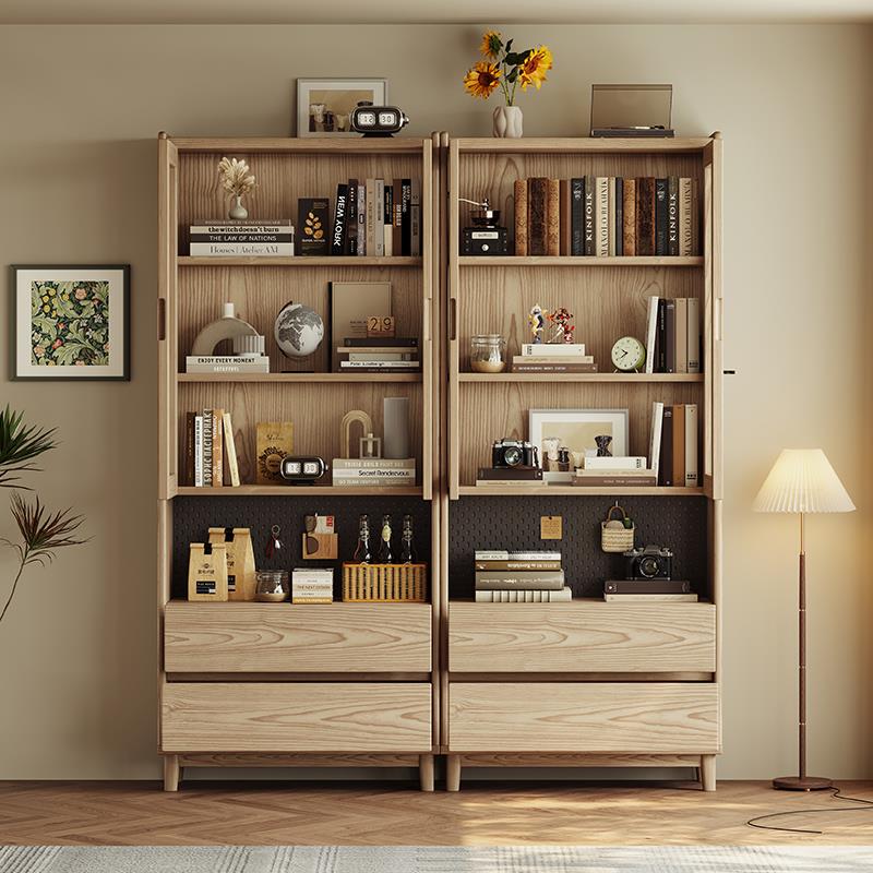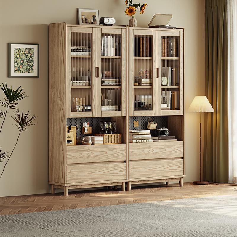 实木书柜家用客厅展示柜可定制柜子中古风带玻璃门单个书柜储物柜