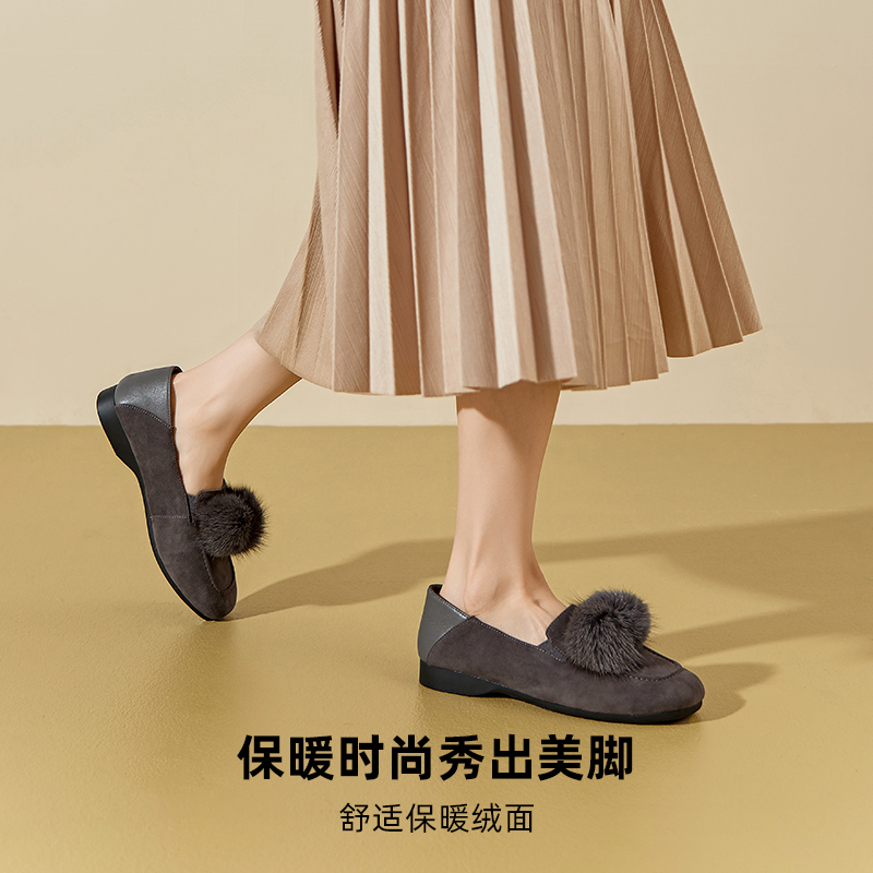瓢鞋 方扣红色单鞋 百思图25秋新款 粗跟浅口女平底婚鞋 丝绒玫瑰