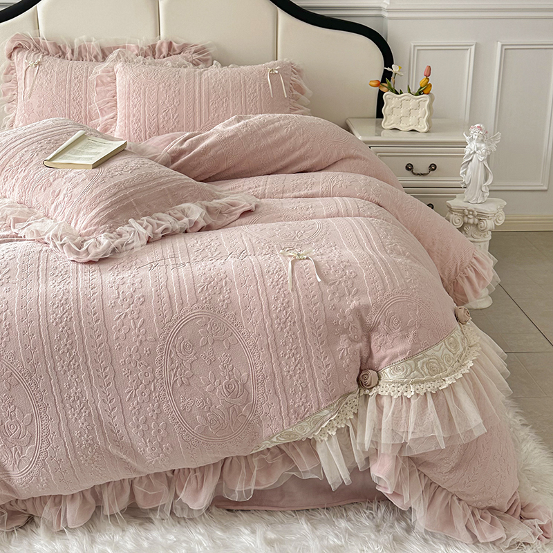 剪花绒雕花绒牛奶绒加厚绣花韩版 保暖四件套蝶花园蕾丝花边秋冬季