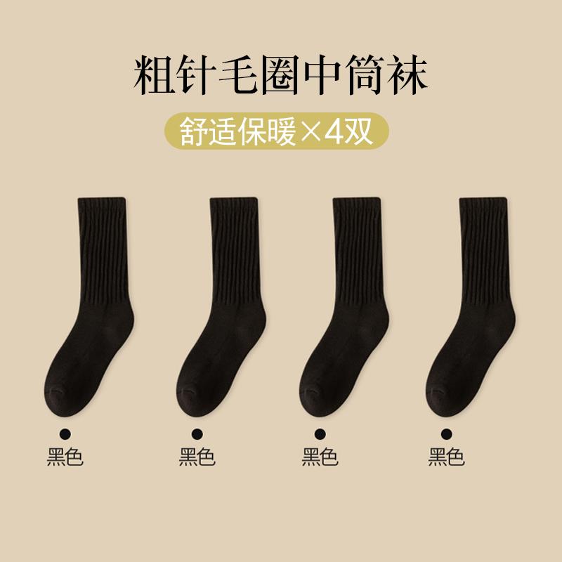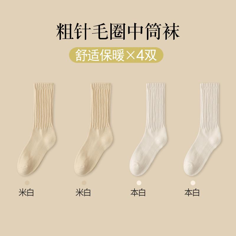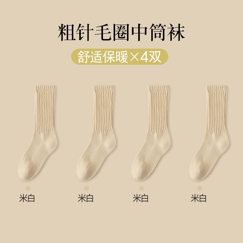 袜子女中筒袜纯棉粗线日系长袜秋冬款 运动白色加厚加绒长筒堆堆袜
