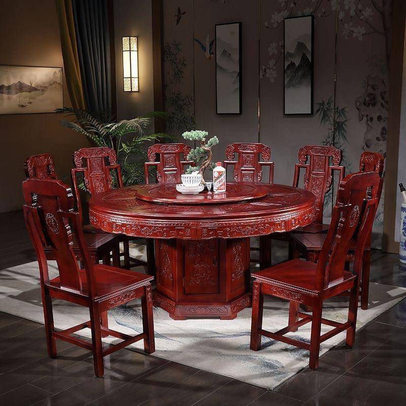 实木仿古雕花家用饭桌酒店大圆桌带转盘明清古典多尺寸餐桌花梨色