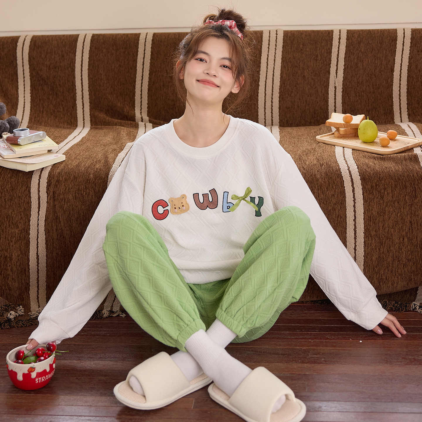 条纹保暖牛奶绒女家居服套装 Gukoo 果壳睡衣女卡通印花新款
