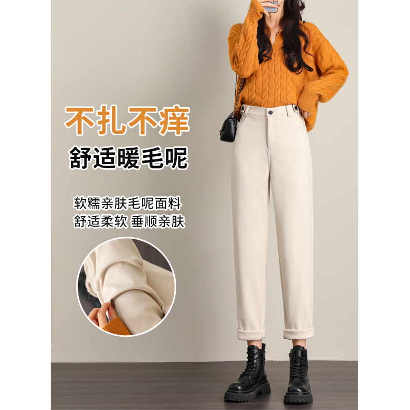 休闲阔腿哈伦萝卜老爹裤 2025爆款 子女秋冬季 米白色加绒高腰毛呢裤