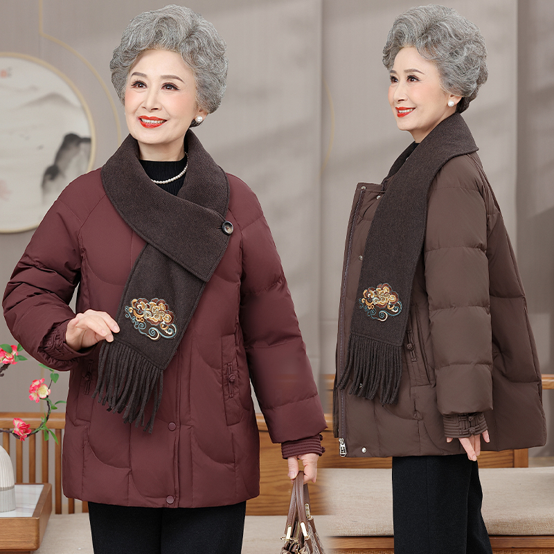 老年人妈妈冬装 奶奶洋气秋冬国风围巾领羽绒服女 外套上衣2025新款