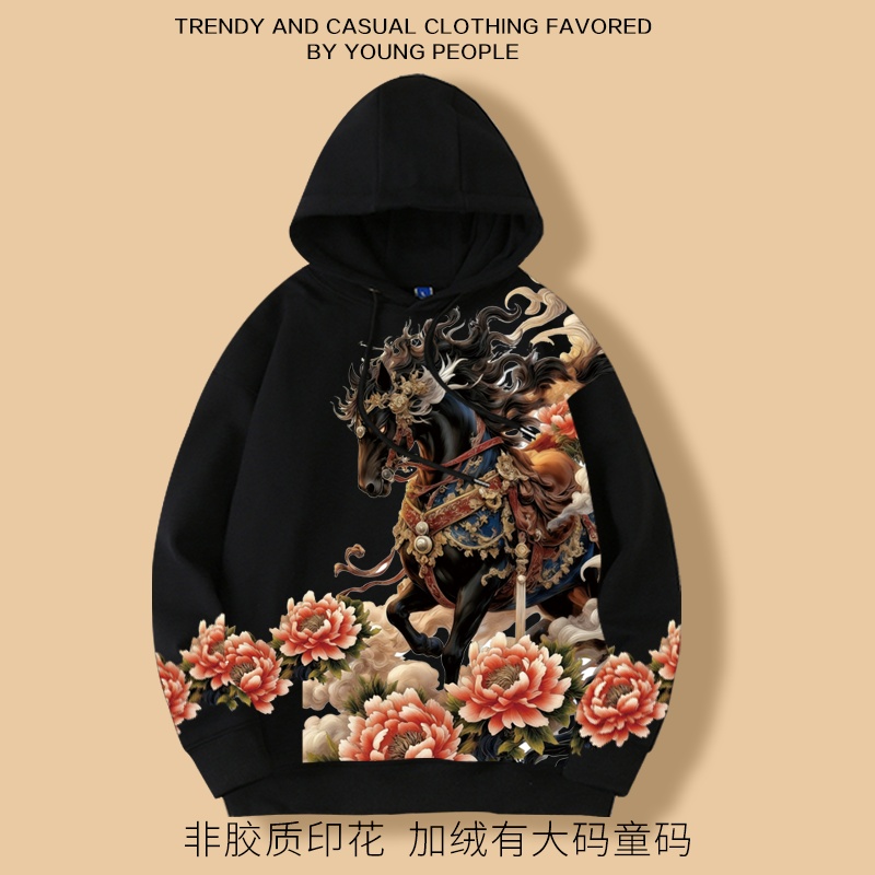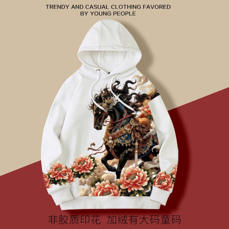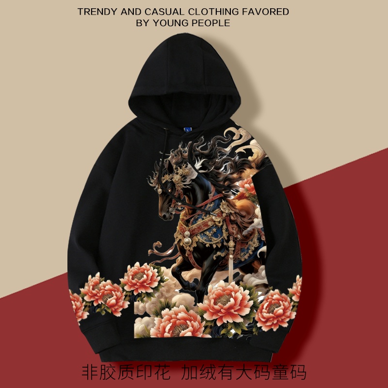 情侣上衣 童码 红色马年本命年连帽卫衣男女帽衫 宽松加绒休闲有大码