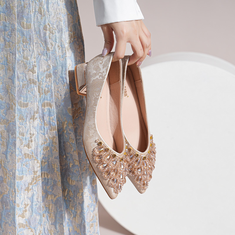 国风尖头单鞋 百搭女鞋 女2025新款 时尚 粗跟中跟手工串珠女鞋 新中式