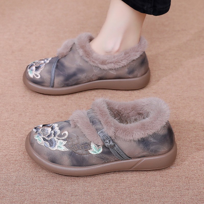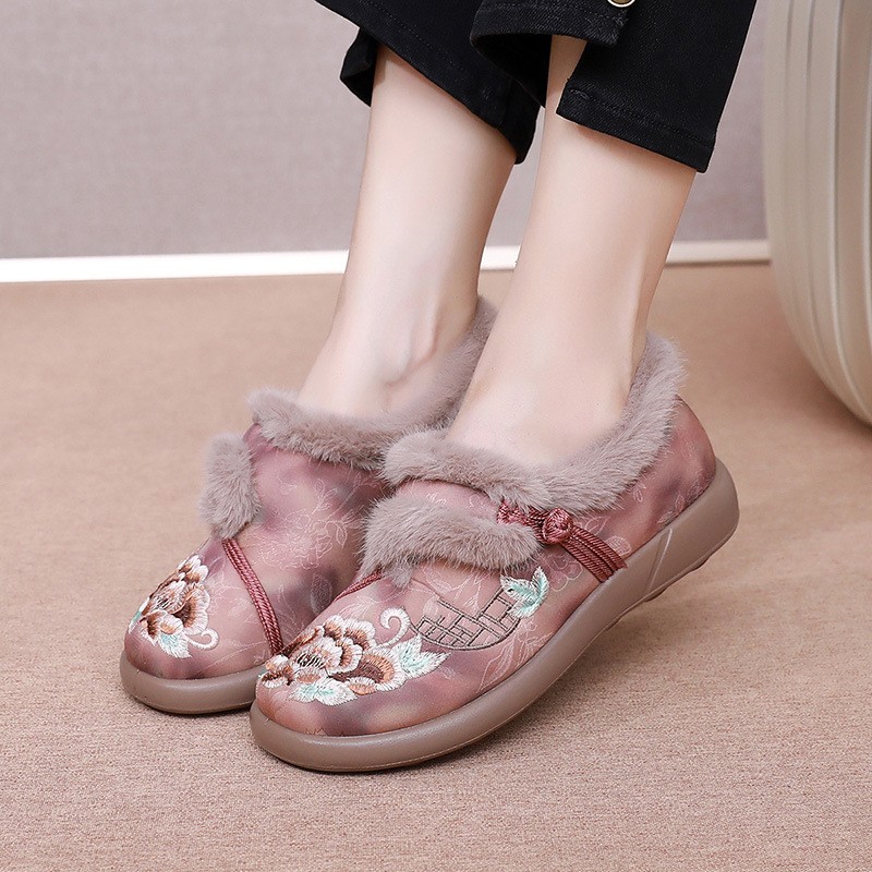 软底一脚蹬妈妈鞋 新中式 加绒加厚国风汉服绣花鞋 女棉鞋 老北京布鞋