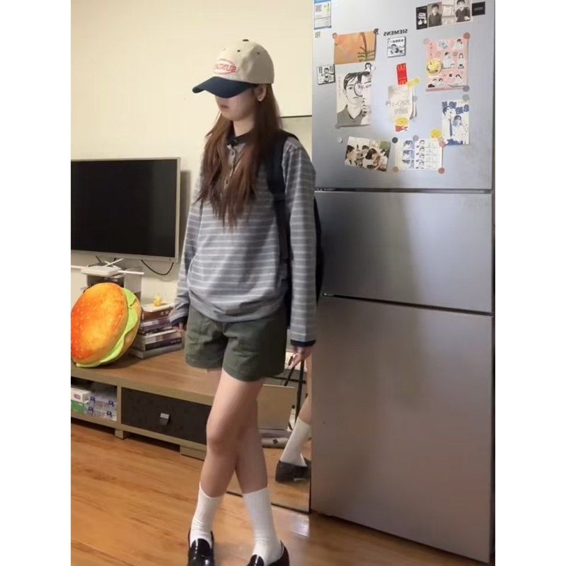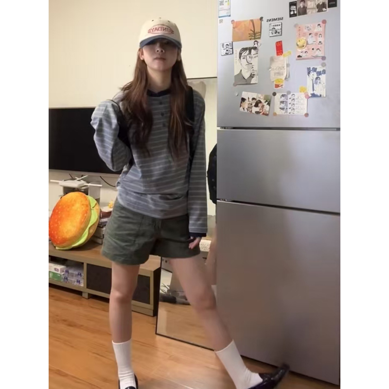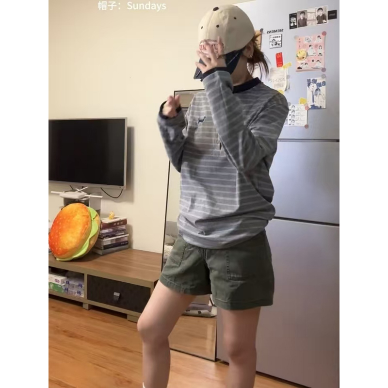 韩系宽松慵懒风显瘦上衣 t恤女早秋季 美式 复古灰色亨利领条纹长袖