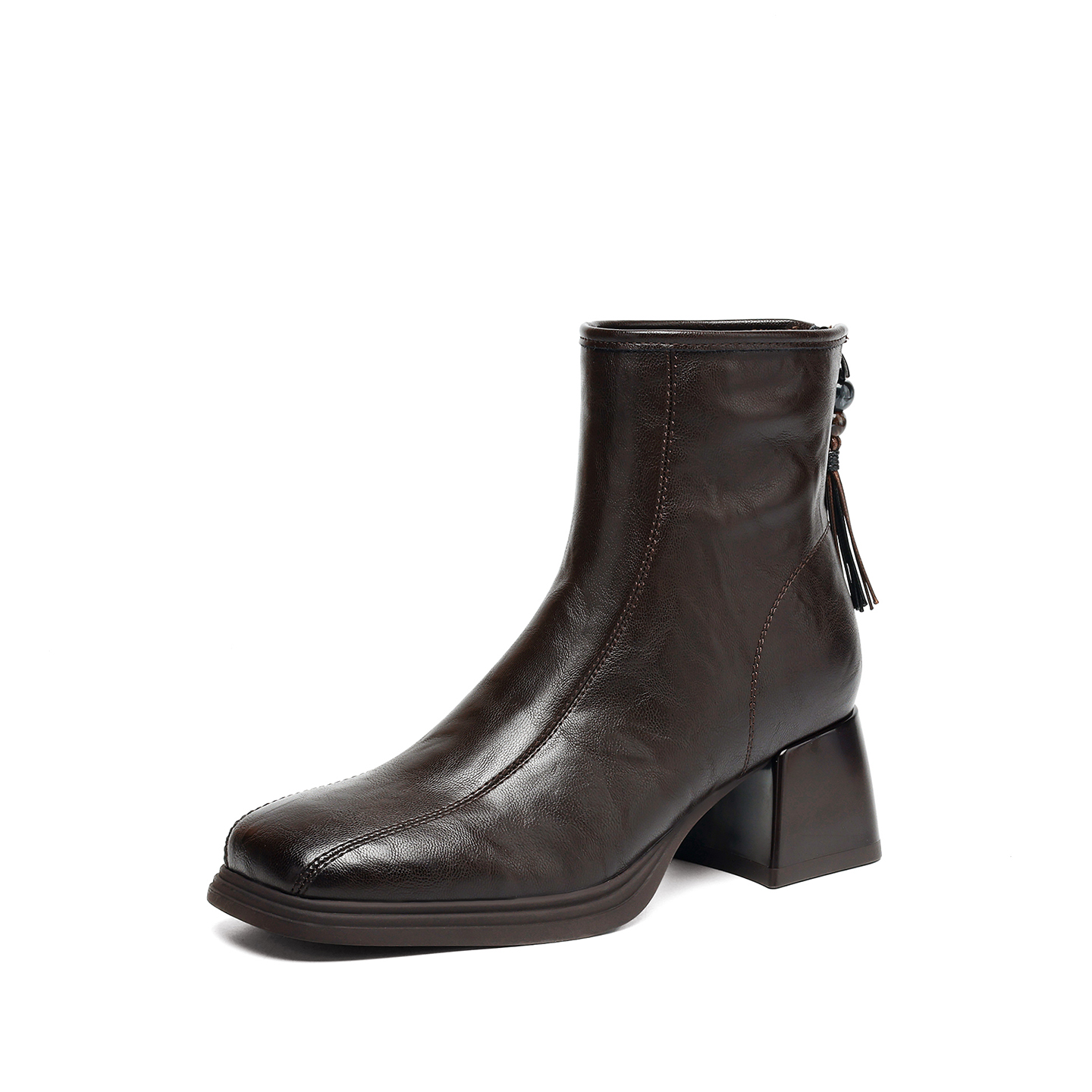 达芙妮棕色短靴女2025新款 小踝靴气质方头高跟瘦瘦靴 秋冬粗跟法式