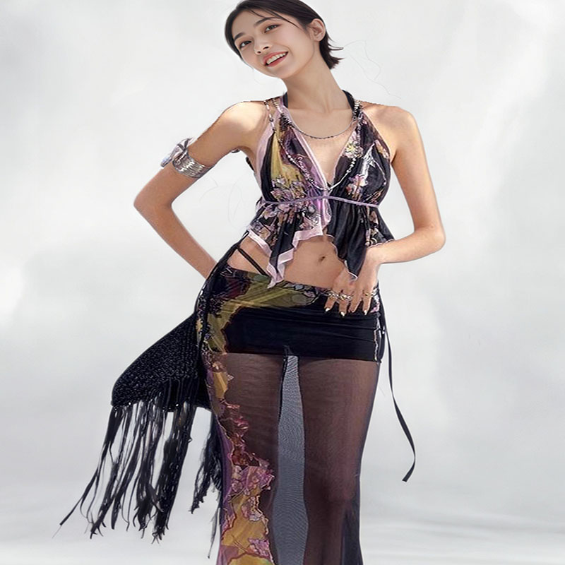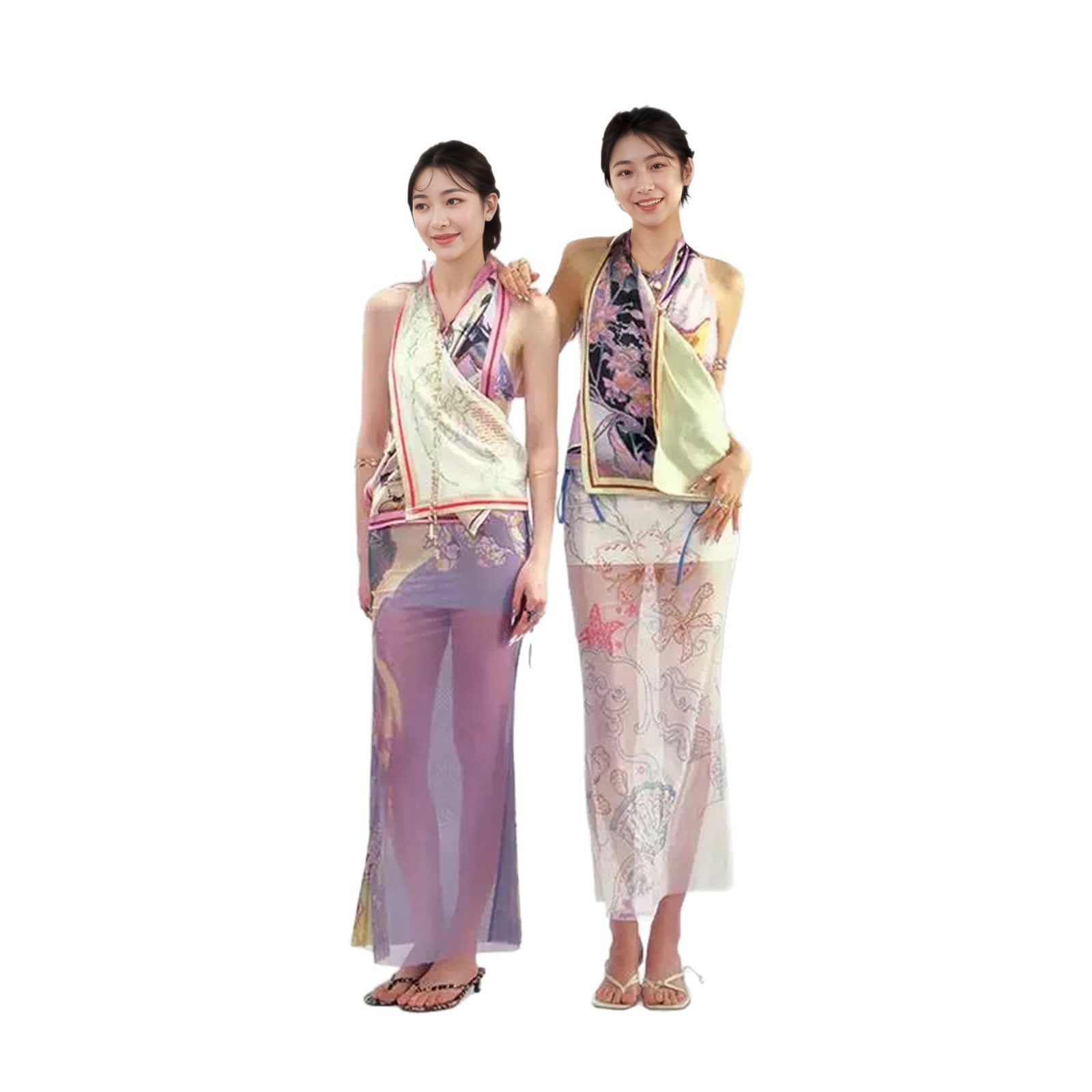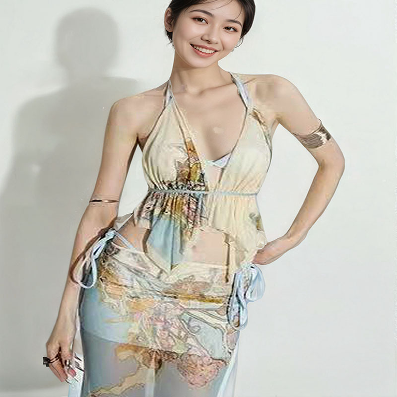 泰式 撞色印花超仙挂脖吊带比基尼女海边度假纯欲性感网纱分体泳衣