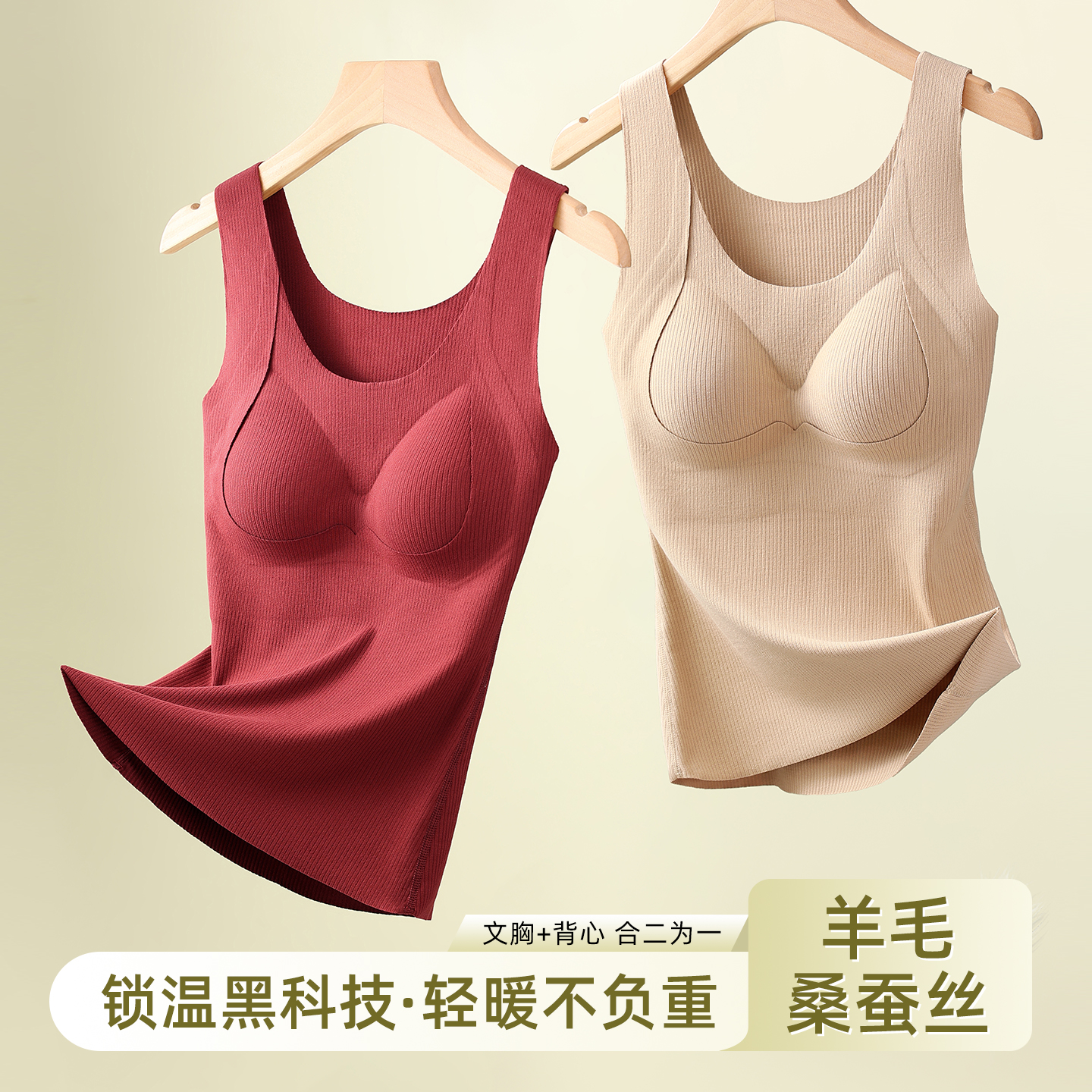 桑蚕丝保暖吊带背心女2025秋加绒加厚发热无痕自带胸垫一体内衣冬