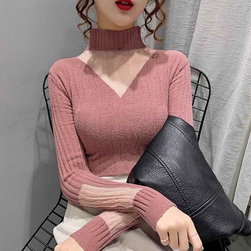 T恤微透女人味上0926r 网纱黑色长袖 阔太太蕾丝半高领打底衫 女季