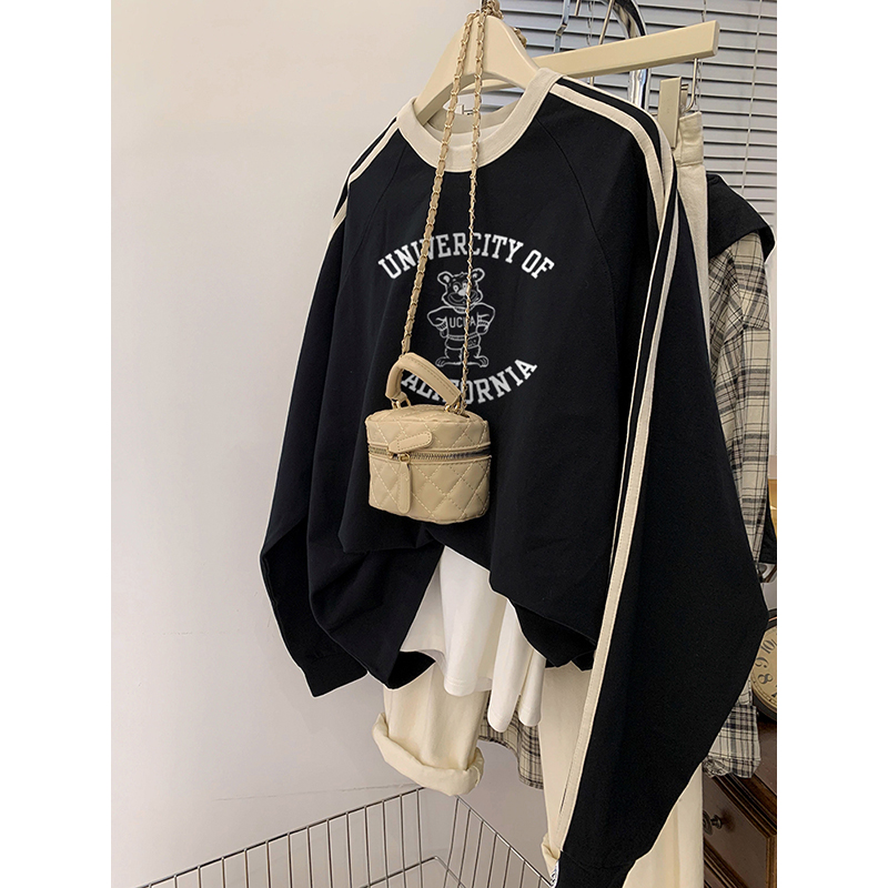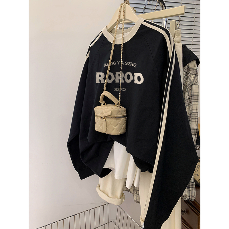 百搭潮牌 上衣大码 美式 复古黑色字母印花卫衣女宽松圆领小众长袖