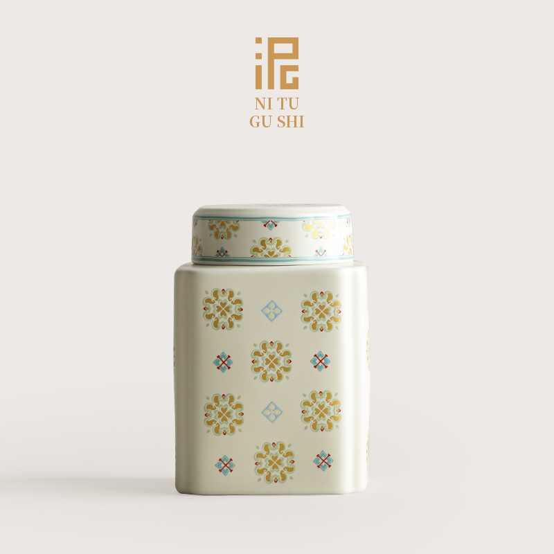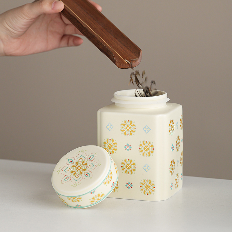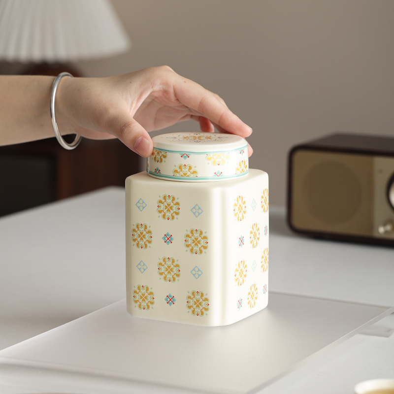 织锦宝相花四方茶叶罐精品高档陶瓷高颜值密封罐小号储存罐防潮罐