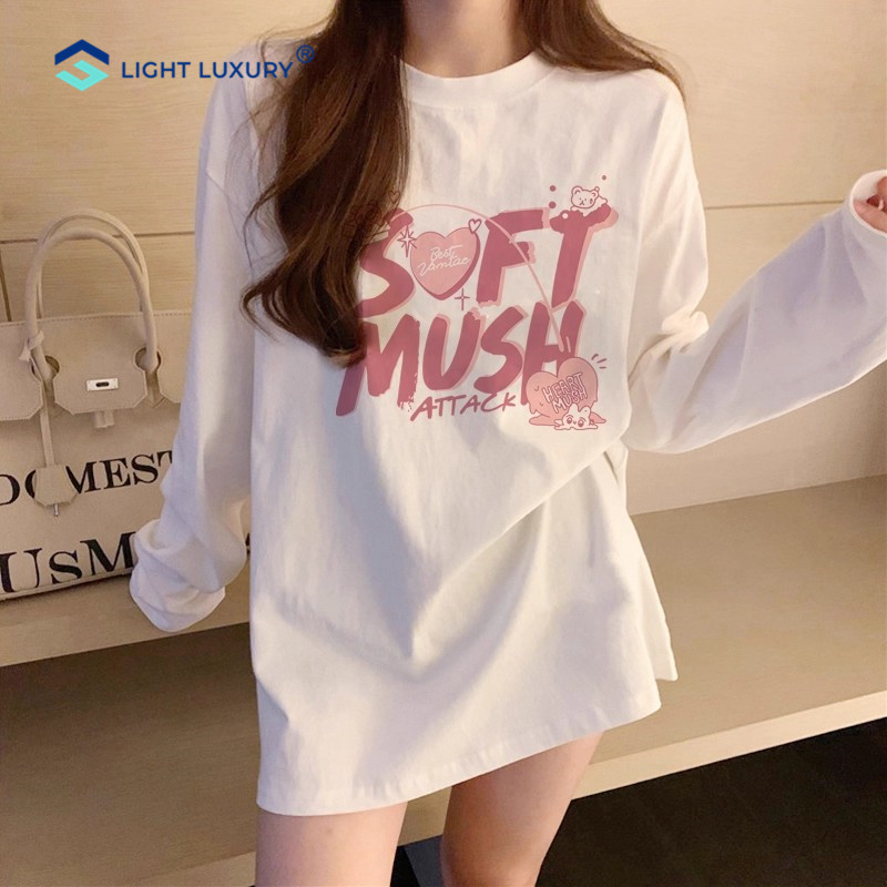 白色中长款 内搭打底衫 印花上衣 加绒保暖宽松大码 棉质t恤女长袖
