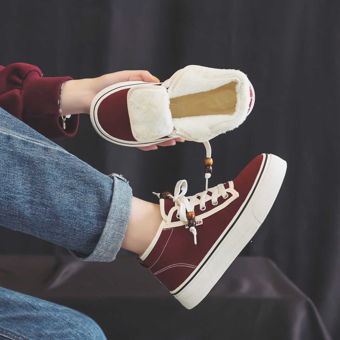 韩版 人本加绒厚底帆布鞋 秋冬二棉鞋 2025新款 潮学生红色女靴子 女款