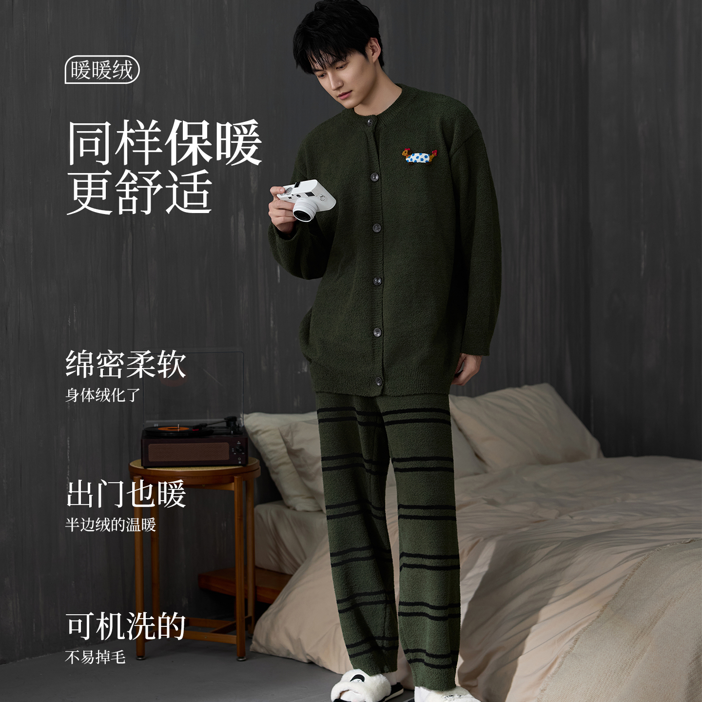 家居服套装 加厚加绒保暖半边绒开衫 冬 睡衣秋冬季 乐姿梦珊瑚绒男士