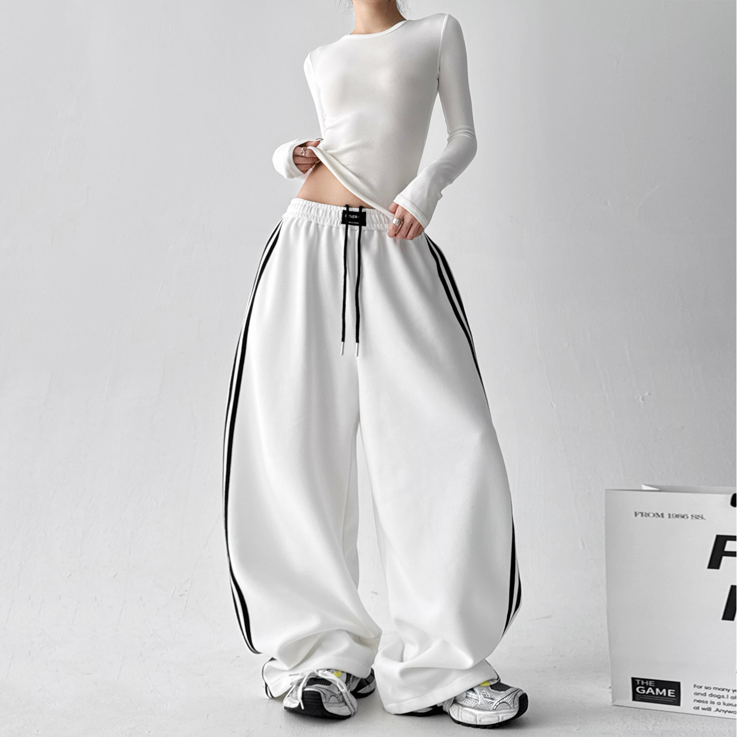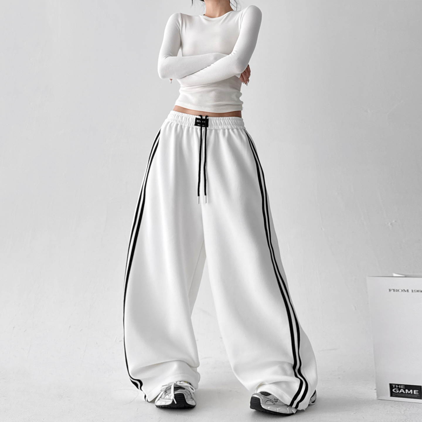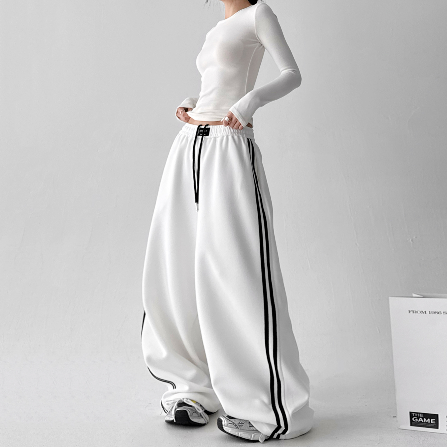 新款 运动裤 白条两条杠休闲裤 阔腿长裤 女高腰显瘦宽松工装 秋季