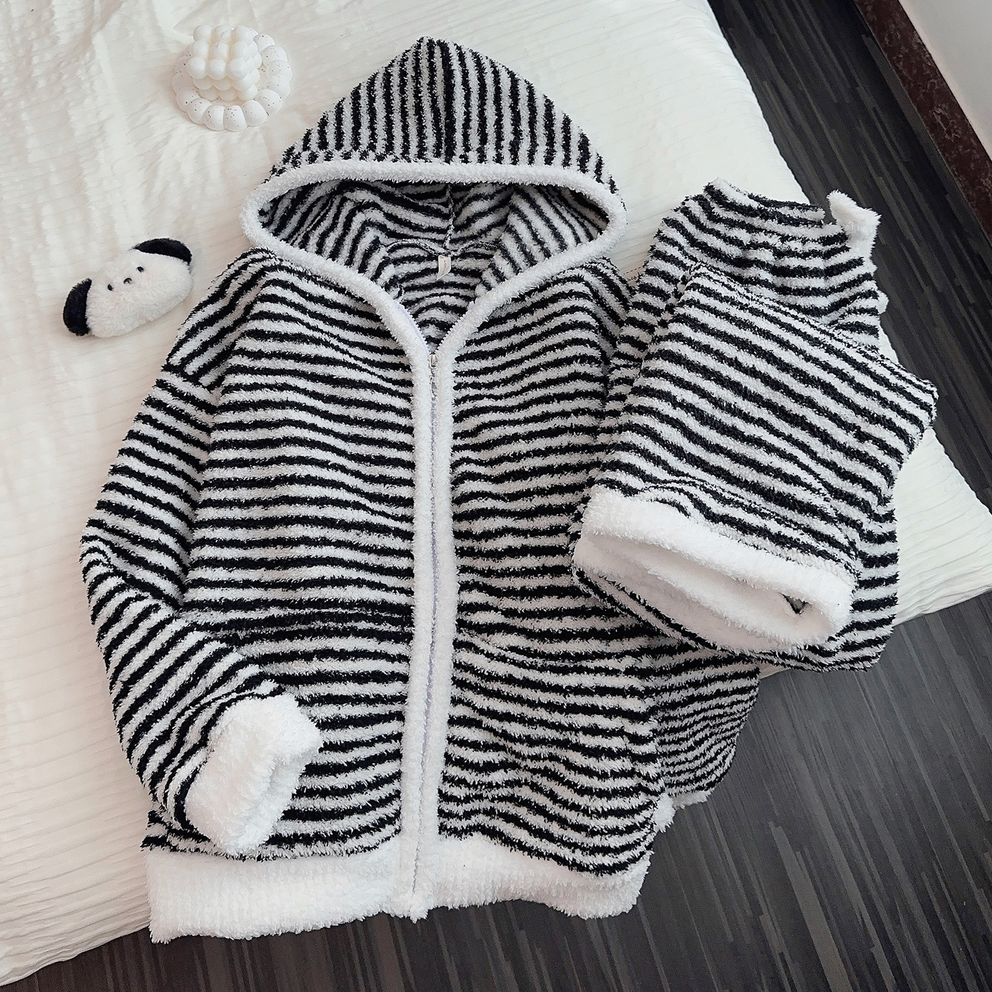 软绵绵睡衣女冬季 冬天可外穿休闲风家居服 条纹连帽半边绒少女套装