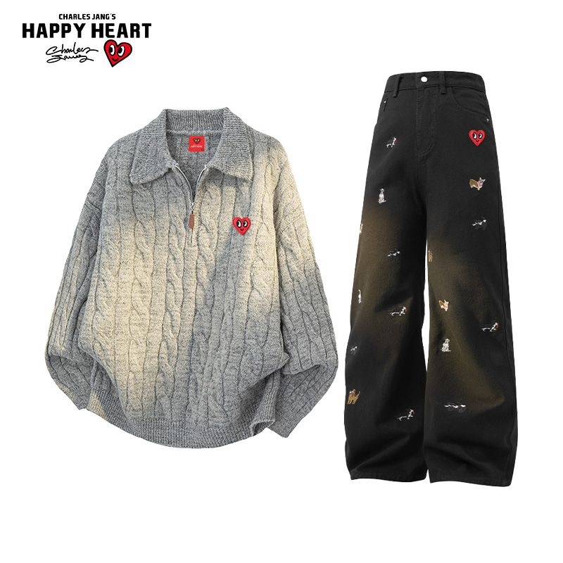 情侣两件套 男潮牌直筒牛仔裤 查尔斯桃心 复古半拉链毛衣休闲套装