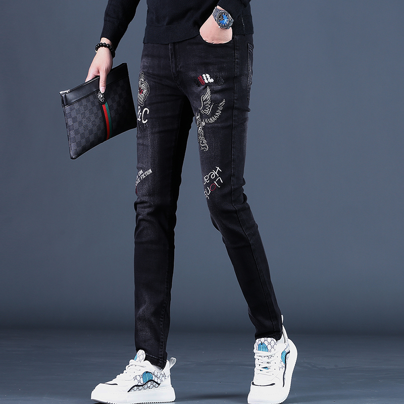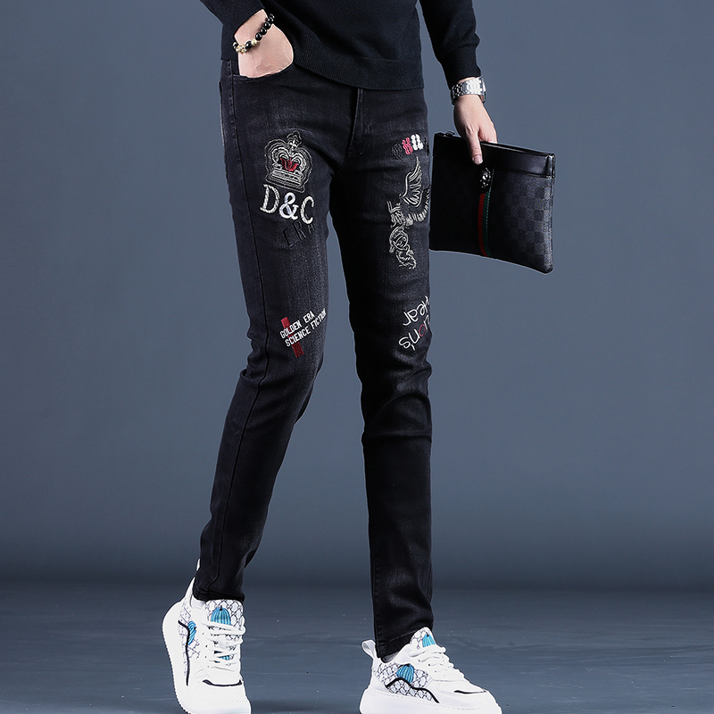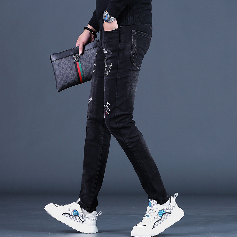 加绒刺绣牛仔裤 2025新款 男士 修身 子潮 秋冬季 休闲潮牌黑色小脚裤 款