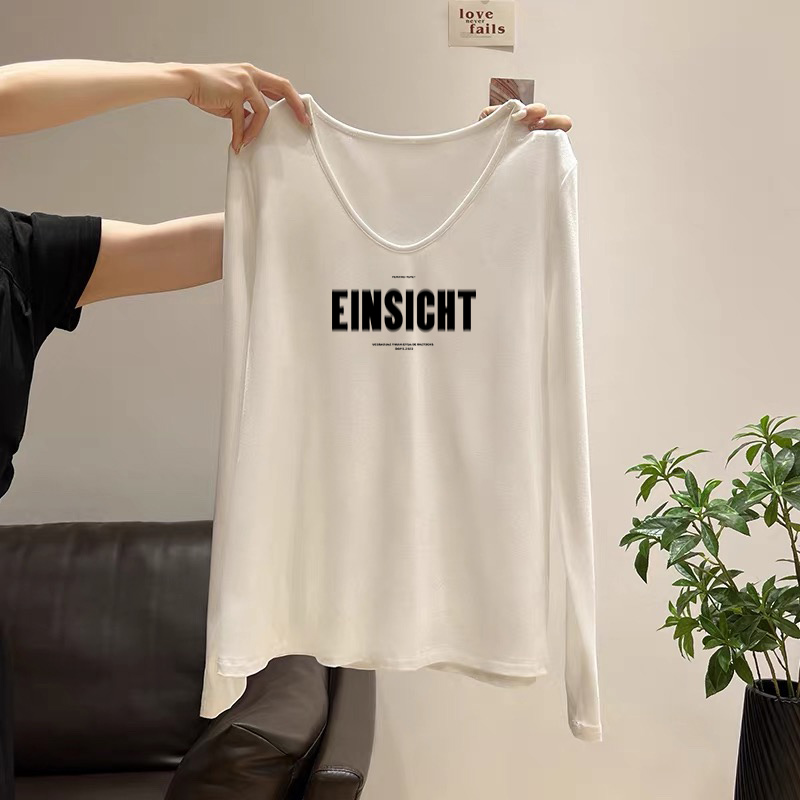 韩系宽松打底衫 女春秋冬磨毛内搭T恤设计感正肩V领上衣服 白色长袖