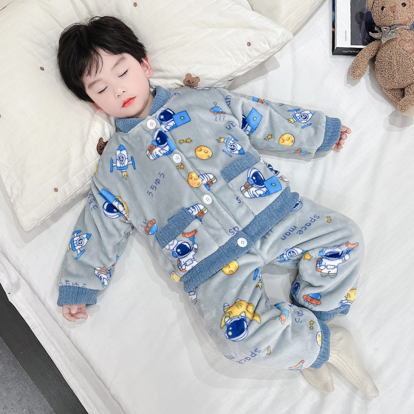 男童睡衣冬季 法兰绒男孩三层加厚衣服夹棉家居服宝宝超厚保暖套装