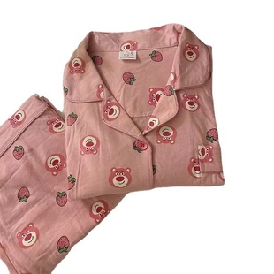 家居服两件睡眠 长裤 草莓小熊粉色睡衣女春秋冬季 宽松可爱卡通长袖