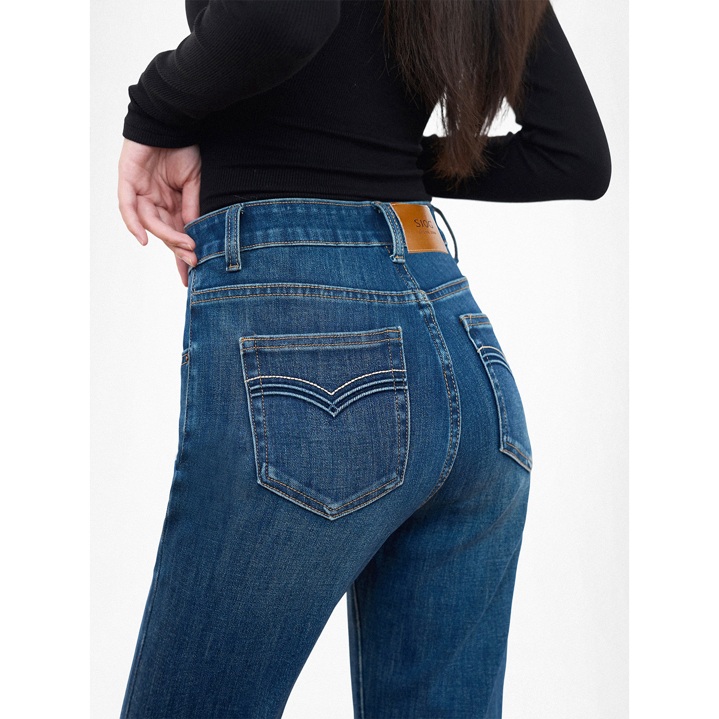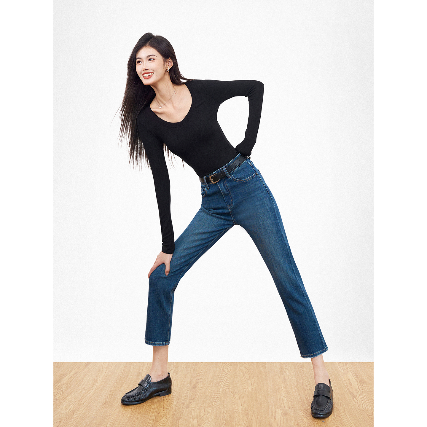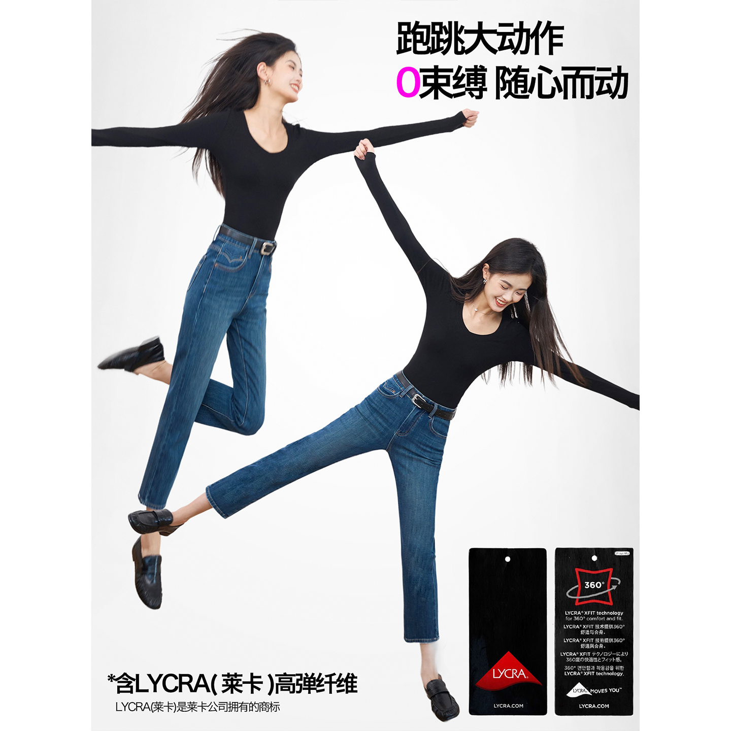 女四面弹烟管小个子九分法棍裤 SJOG显腿巨直 深蓝高腰直筒牛仔裤