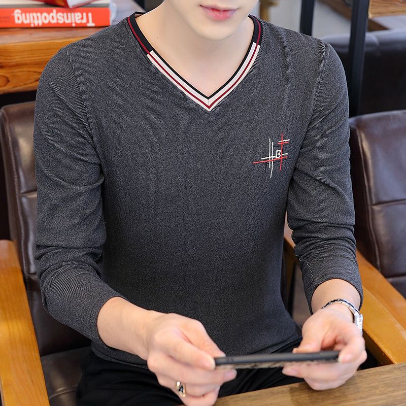薄款 修身 打底衫 男士 男生鸡心领针织衫 T恤春秋季 潮流小衫 V领长袖