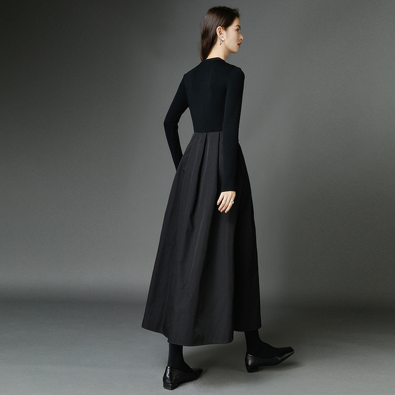 富家千金风收腰a字裙 2025新款 法式 赫本风假两件黑色连衣裙女秋装