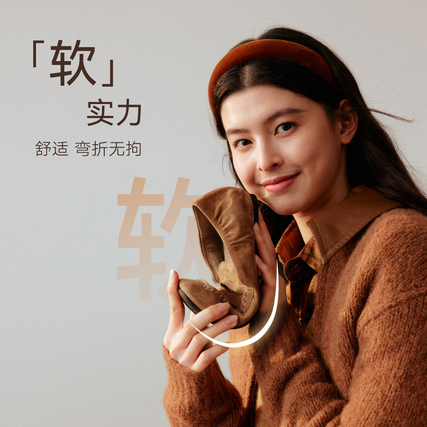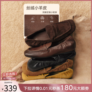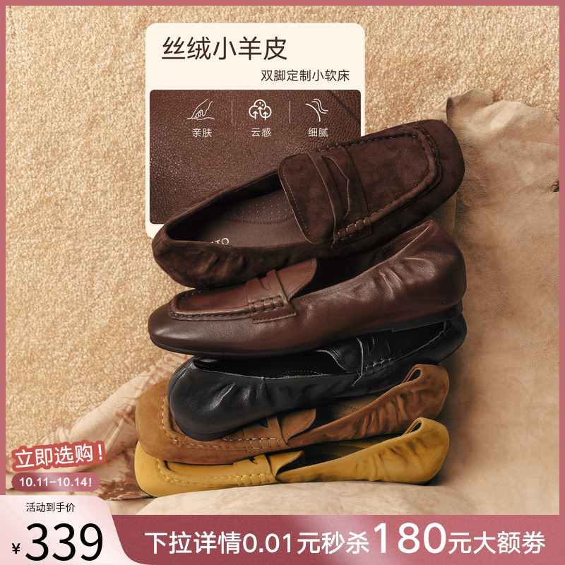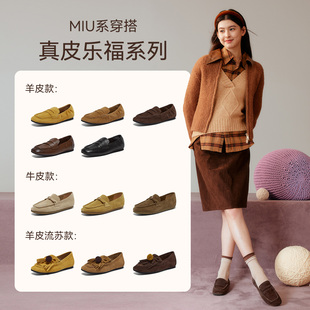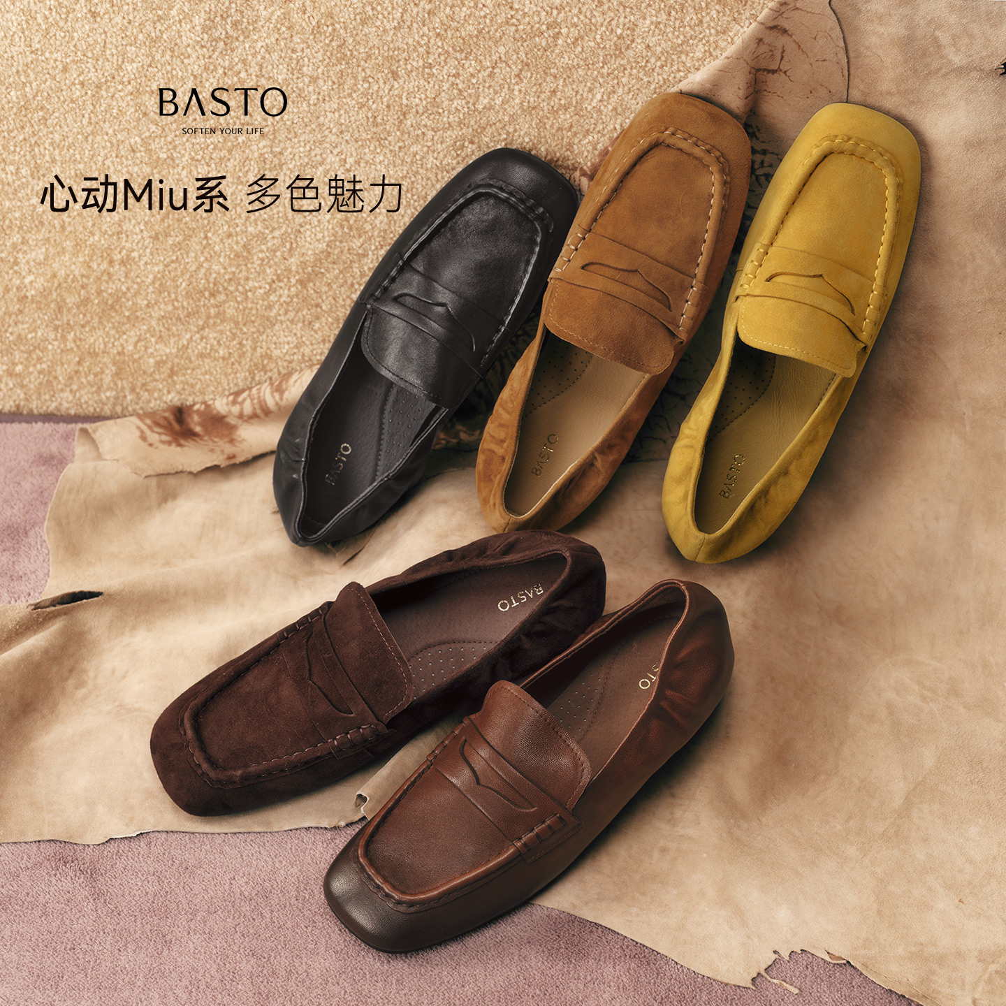 女单鞋 百思图25秋新款 英伦豆豆鞋 miu系乐福鞋 UXE01AA6 绒面羊皮鞋