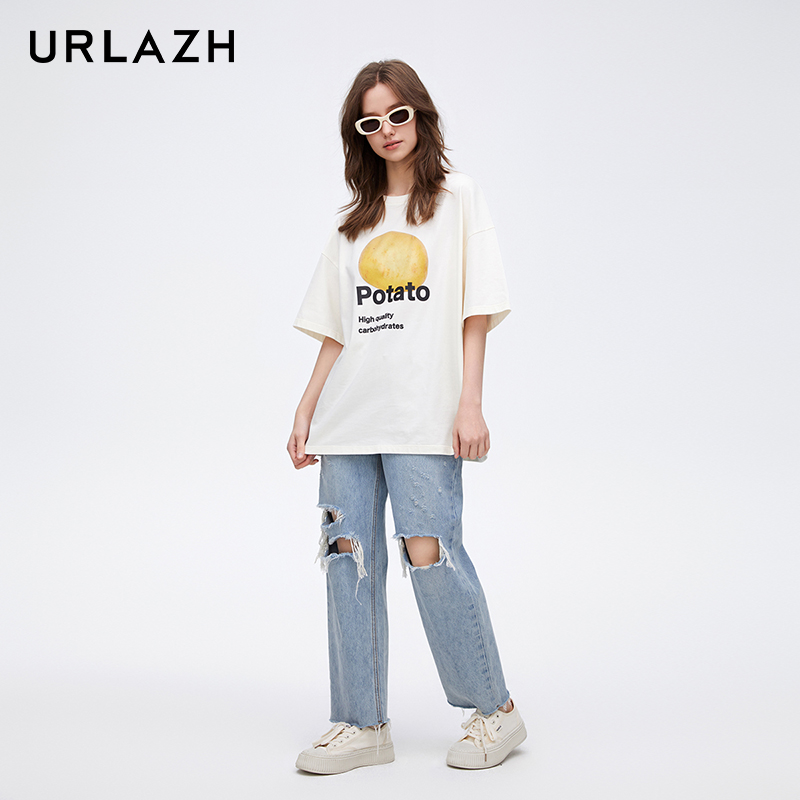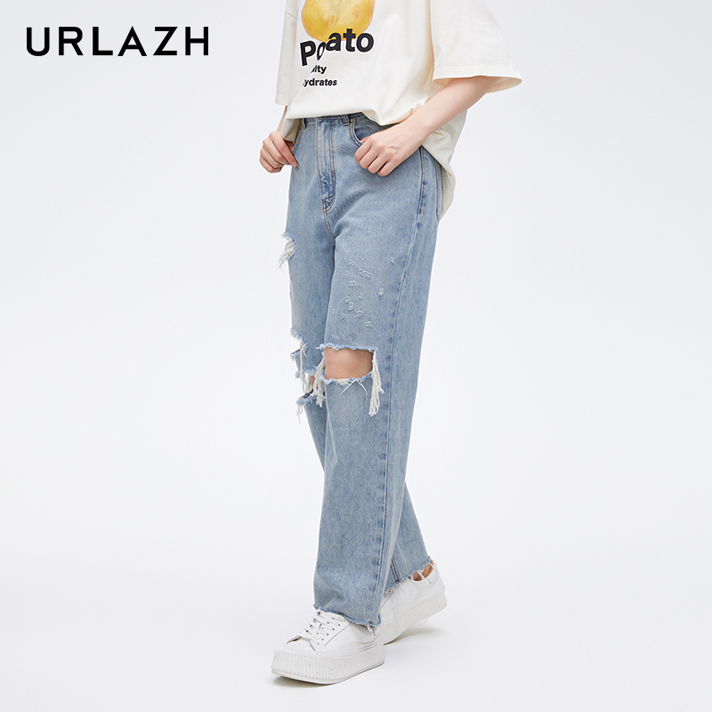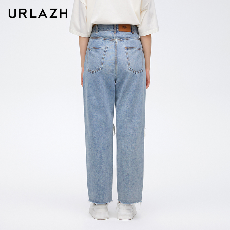 URLAZH有兰新款 女 纯棉复古蓝破洞宽松毛边牛仔裤
