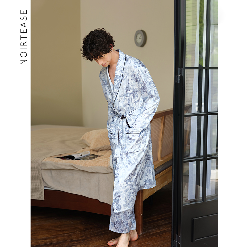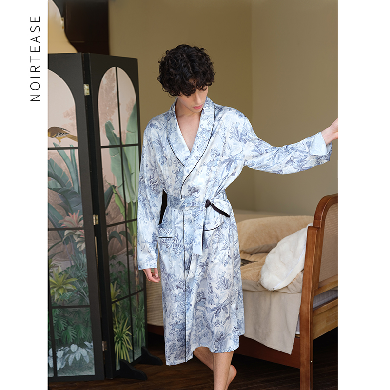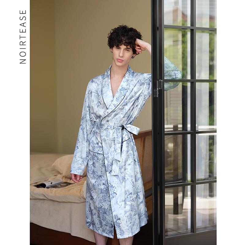 系带浴袍家居服可外穿 睡袍睡衣中长款 NoirTease春秋薄款 丝质男士
