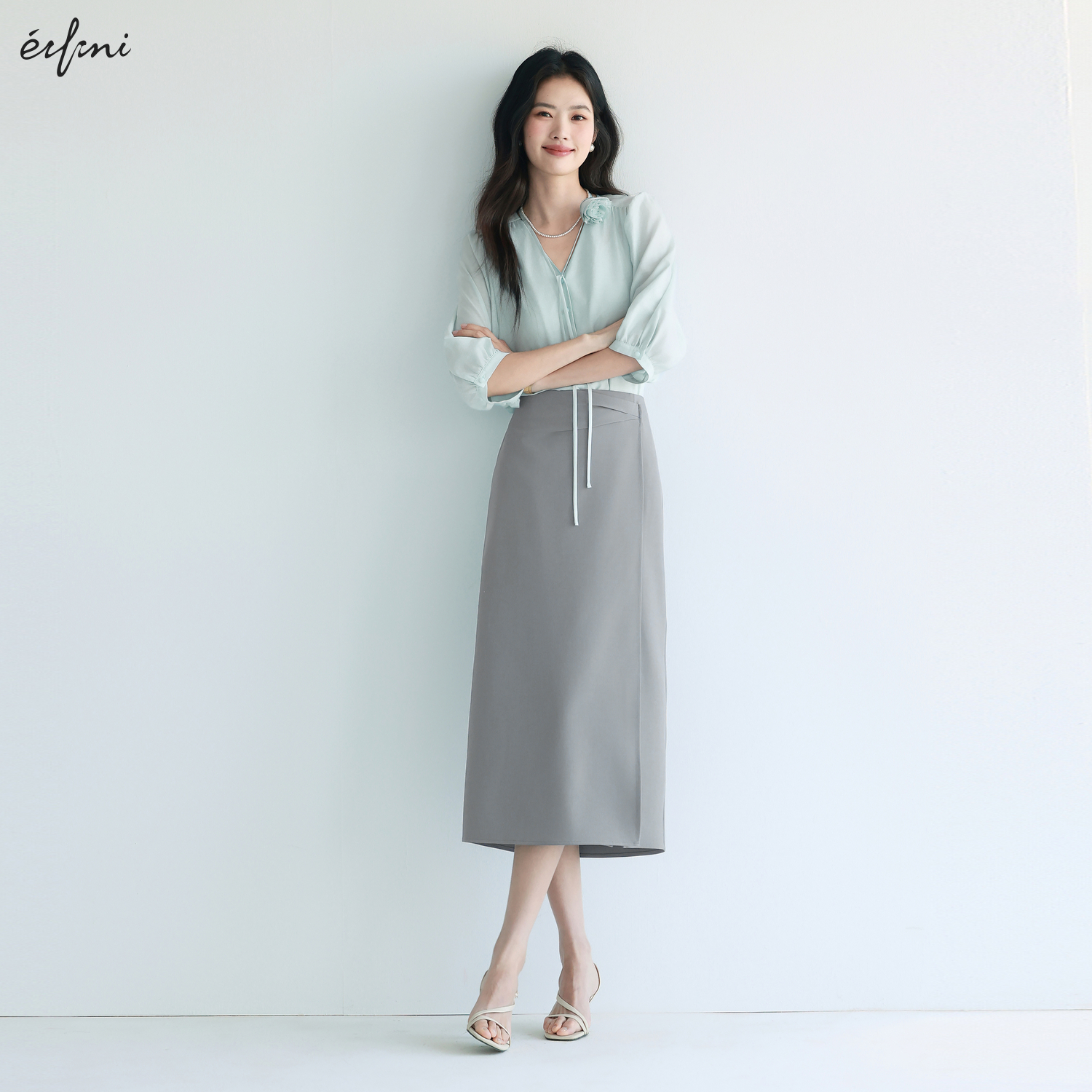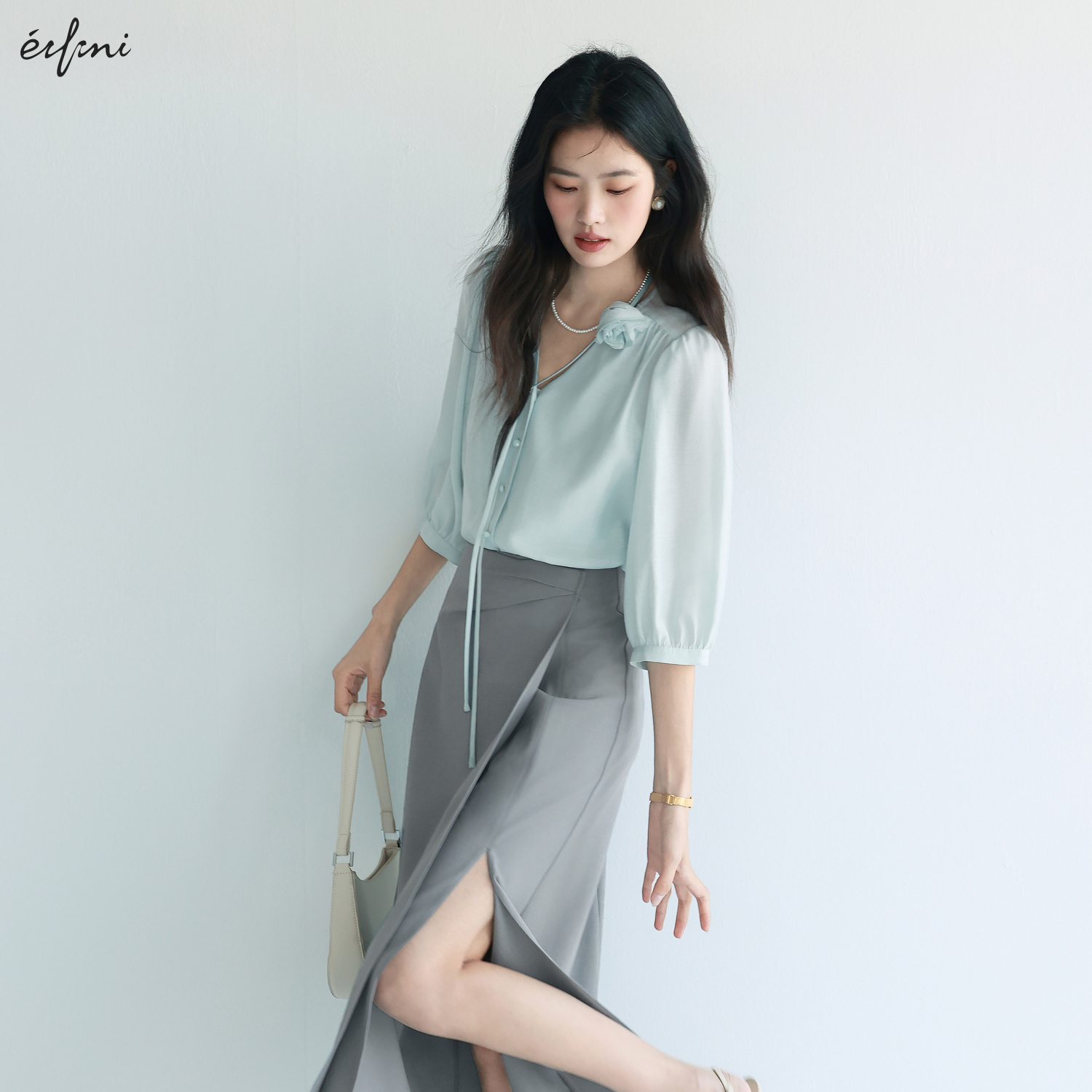 新款 伊芙丽醋酸简约带胸花职场薄款 女小上衣2025夏季 衬衫 短袖