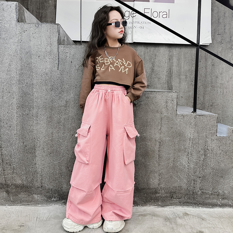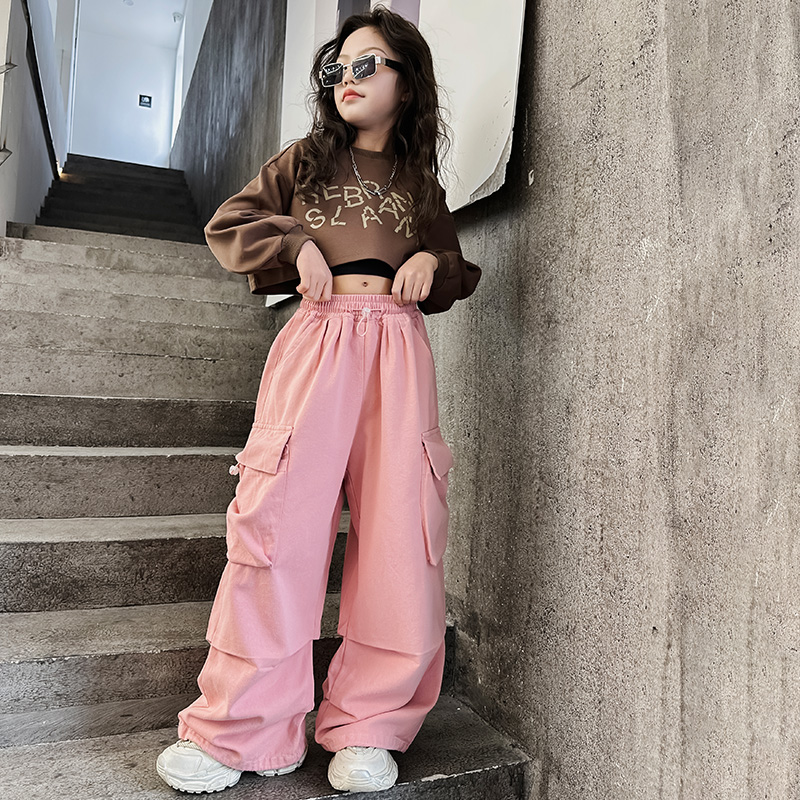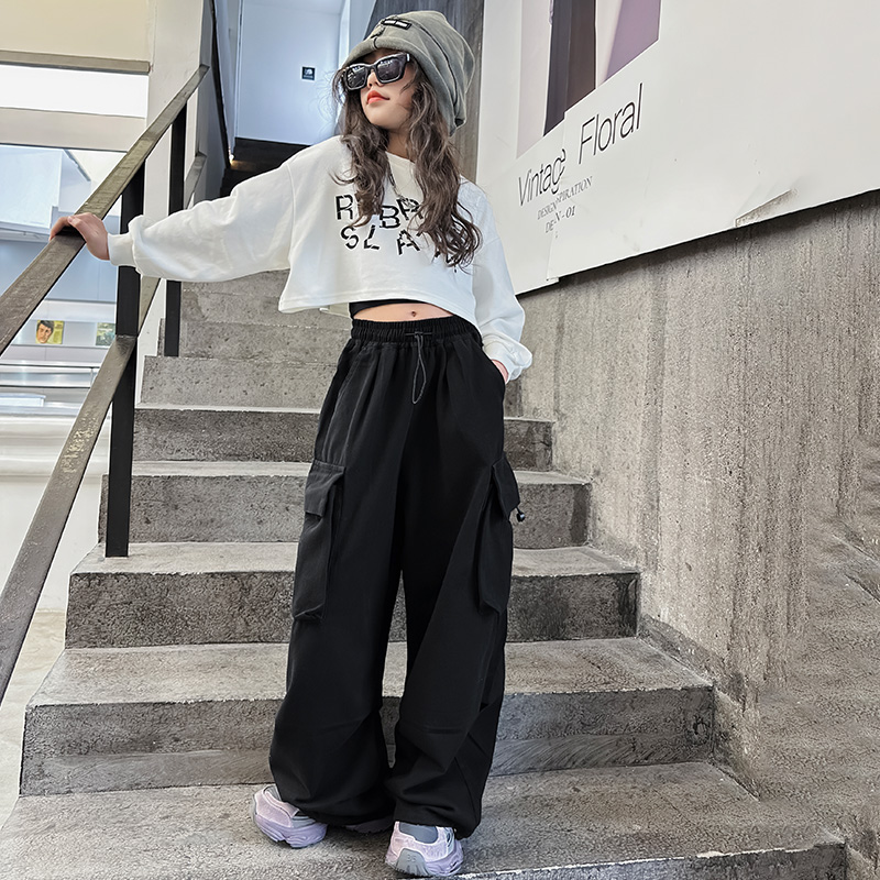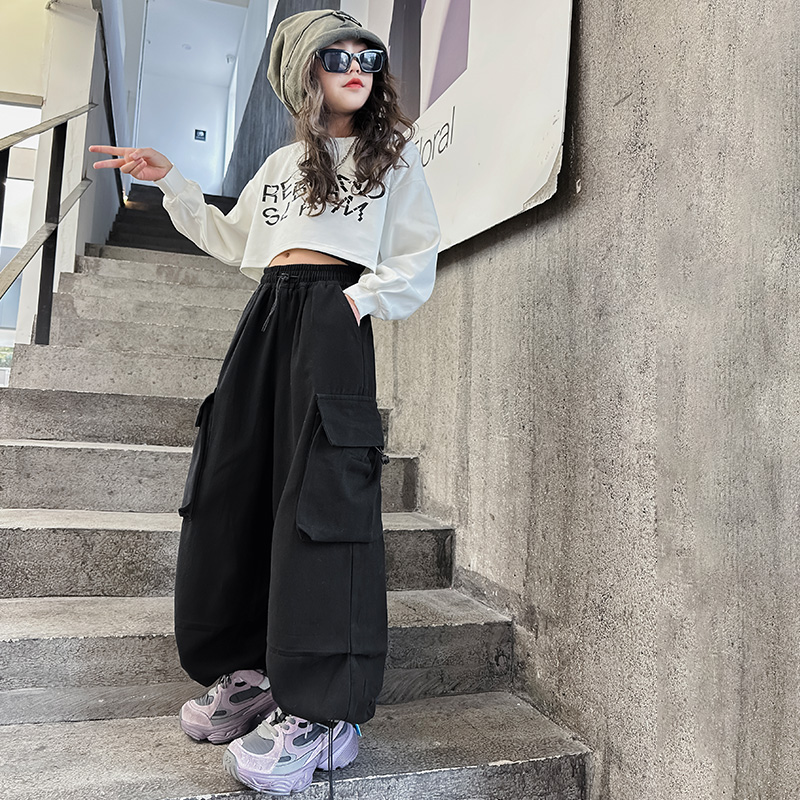 裤 子女孩大童春秋潮酷穿搭阔腿裤 女童秋装 儿童裤 2025新款 黑色工装