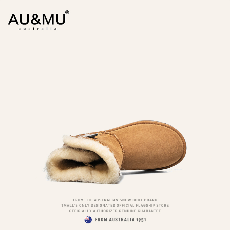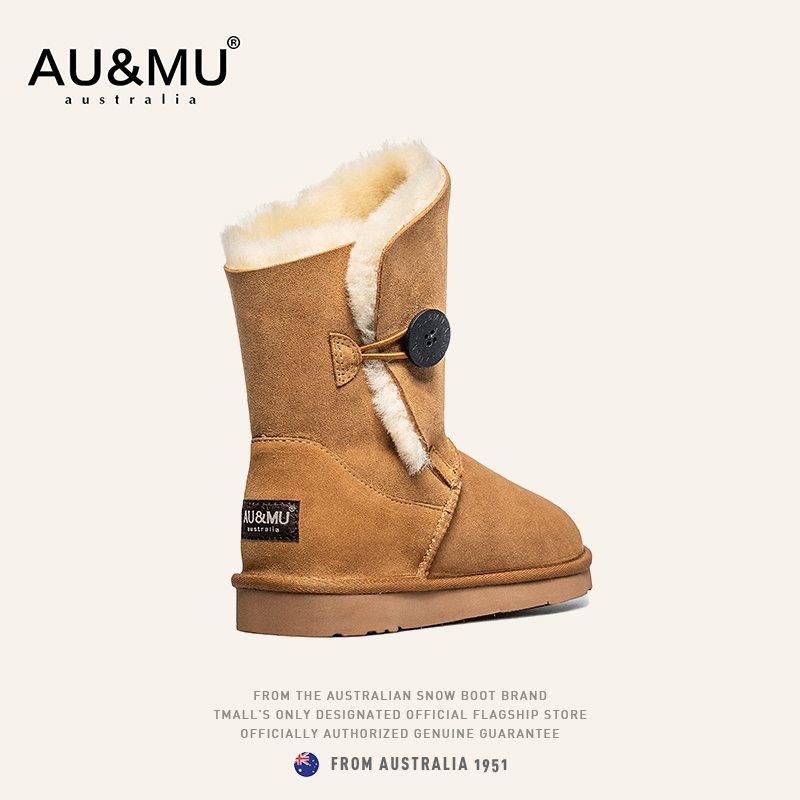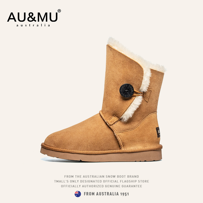 AUMU冬季 女 雪地靴女加绒加厚保暖平底皮毛一体中筒靴东北纽扣棉鞋