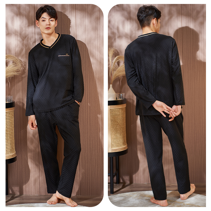宽松V领套头家居服套装 棋盘格子男士 休闲大码 纯棉长袖 睡衣春秋季