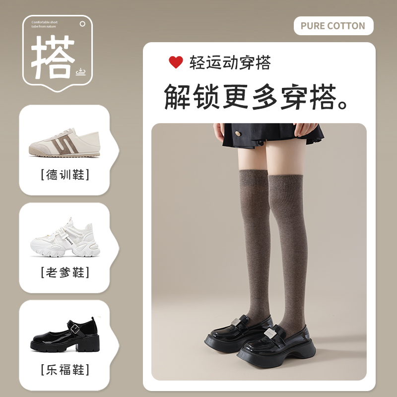 小腿袜子女纯棉春秋季 高筒咖色及膝袜半筒 压力袜套长筒全棉秋冬款